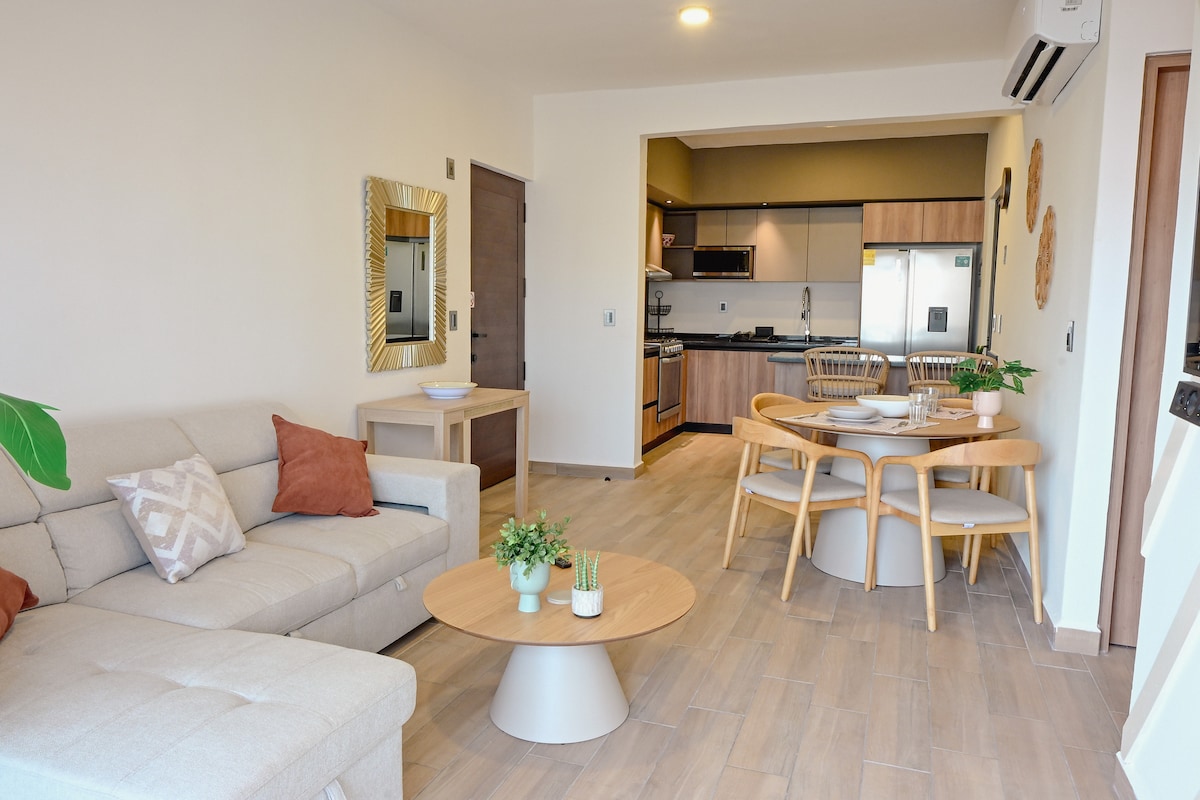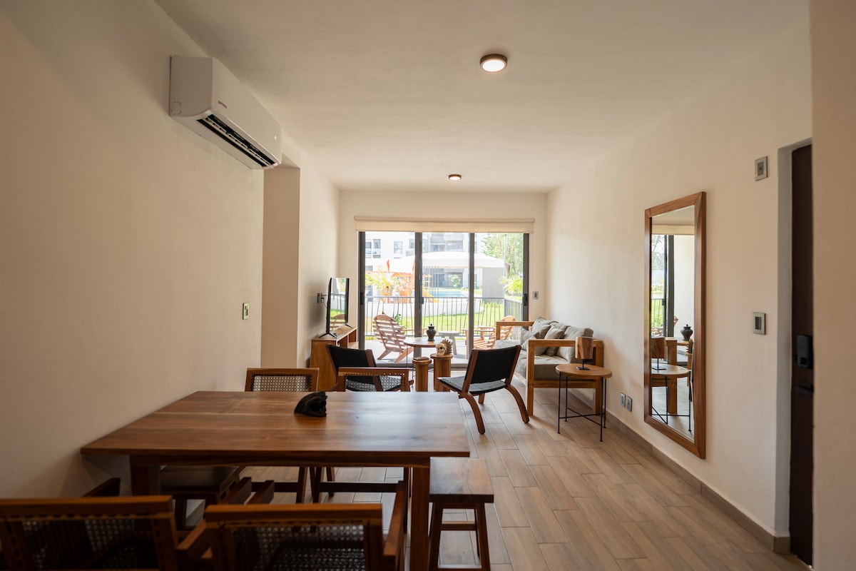 Welcome to your brand new retreat! Enjoy and relax on your family vacation or during your digital nomad life in this apartment made just for you. Relax on the balcony after a day working in the apartment´s office or in the co-working space, dive into the shared pool or explore the complex's amenities. Conveniently located in a quiet private residence near Xcaret, and a 15 minutes drive to the beach. Discover the multiple and diverse attractions our region offers. Your perfect getaway awaits!
