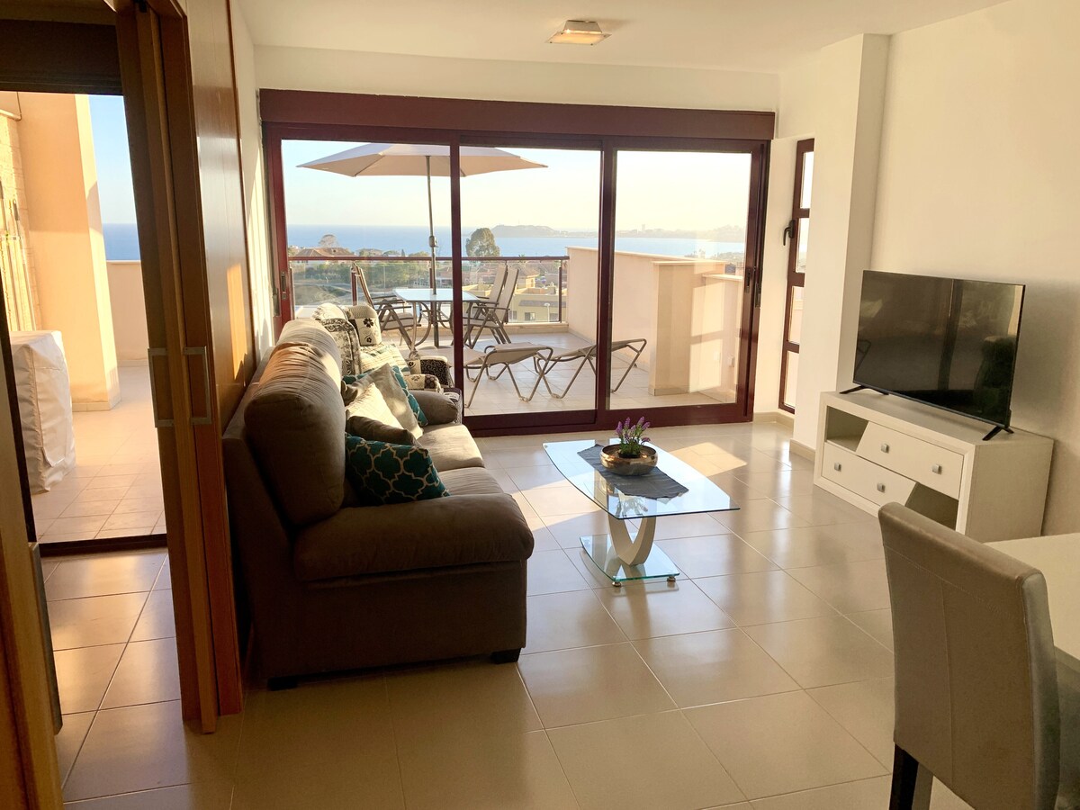 Have fun with the whole family at this stylish place. This is a 2 bedroom 1 bath penthouse located in Isla Plana on Mojon Hills with an amazing view of the Mediterranean Sea. There is an oversized patio with an outdoor sitting area as well as outdoor bar sitting that overlooks at the Port of Puerto Mazarrón. The closest beach is a 15-minute walk. The town of Isla Plana center also 15-20 minutes walk. There are shops,supermarkets, pharmacy,bakery a social bar with magnificent views of the sea.