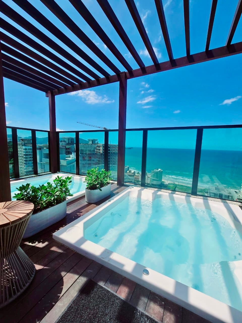Enjoy an exclusive stay in this high-end apartment, facing the main avenue and just a few steps from the beach. Master suite with ocean view, king size bed and whirlpool. Second suite also with spectacular view. There are 3 en-suites, plus a toilet, accommodating up to 8 guests with extra mattresses. Air conditioning and Smart TV in the living room, plus a complete trousseau and equipped kitchen. Two side-by-side spots. Close to markets, pharmacies, restaurants, stores and Russi & Russi mall. Do everything on foot.