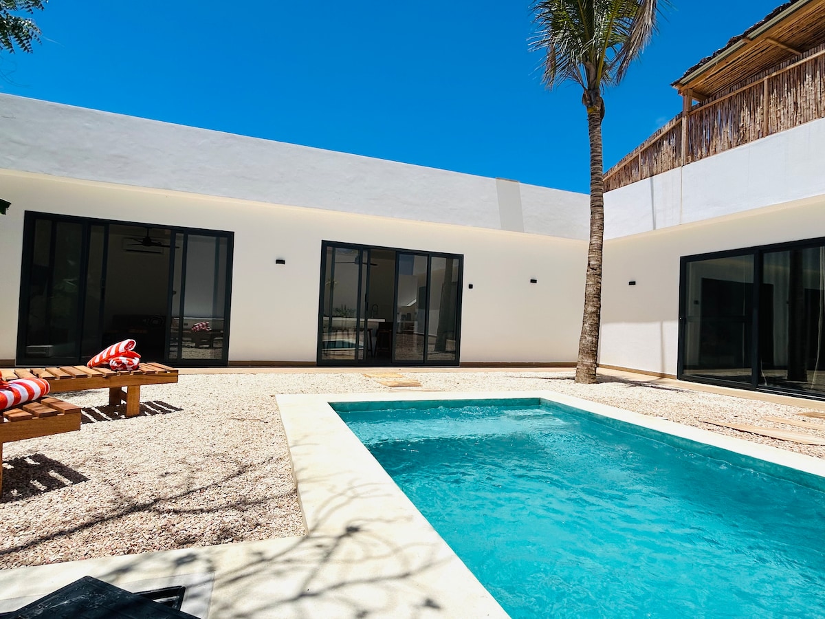 Tropical modernism and Swahili heritage merge in this 5 bedroom serviced villa located on the coast of Zanzibar, 4 km south of Jambiani. Built on a beautiful coral stone beach, we offer a sense of exclusive seclusion, only a few minutes drive from Jambiani. Our luxury villa guarantees full privacy and comfort of a real home on a 2500 sq meter property, offered with a chef, villa manager and daily housekeeping. You have exclusive use of two pools, large tropical garden, and a yoga/gym space.