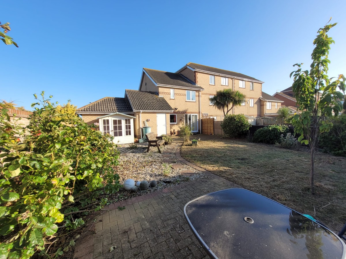 Enjoy a break in our newly refurbished 2 bedroomed Mid Terraced house within a 1 minute walk to our Martello Bay beach in Clacton. Our house is in walking distance to Clacton town for restaurants/cafes/pubs and Pier. 30 mins drive from Colchester & Harwich Ferry Port. The house has 1 DB bedroom, 1 bedroom with adult size bunk beds, kitchen/diner, bathroom, living room with a 55" TV and free Wifi. Fully Electric. Private parking. Rear access with fenced garden, shed & patio table/chairs.