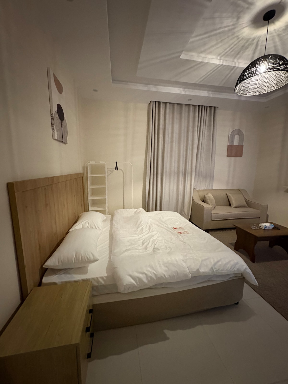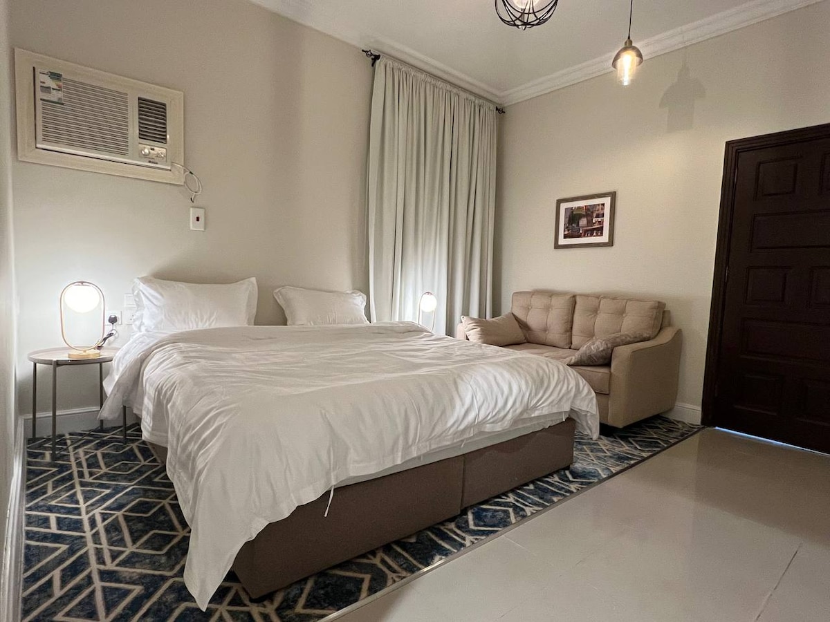 حياك الله في الشقة الرايقة، الغرفة فيها سرير بحجم كينج عشان تنعم بليالي مريحة. الأجواء مفعمة الروقان مع المفروشات الناعمة والديكور الجميل اللي يعطيك طاقة هدوء كل صباح. الصالة مجهزة بكنبة مريحة، مناسبة لجلسات القهوة مع الحبايب. طاولة الخدمة فيه أجهزة حديثة ومساحة على الكاونتر. ودورة المياه فيها دش منعش. هذي الشقة أكثر من مجرد مكان تسكن فيه - هي مساحة دافئة ومرحبة تقدر تصنع فيها أجمل الذكريات!