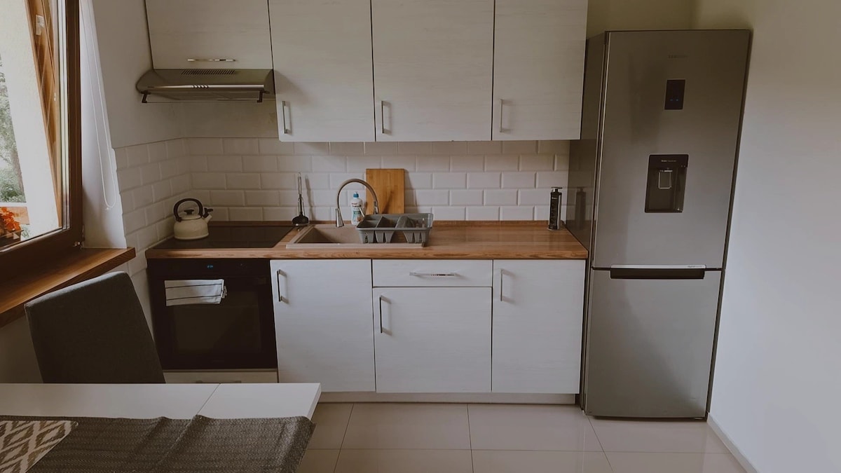 Welcome to a 48 sqm apartment, situated 200 meters from the National Park of Giant Mounts border. It is the only apartment in this building. Below there is a sauna for Guests and a private garage. You will find here place for up to 4 Guests. We installed central heating and a fireplace. Apartment Jagodka has a sunny 10 sqm balcony, living room with a fireplace, fully equipped kitchen, elegant bathroom and a bedroom. There is also a free parking place for Your car/cars.
