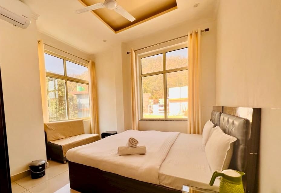 Escape to a peaceful Rishikesh retreat with stunning Ganga & mountain views. This cozy unit sleeps up to 3 guests with 1 bedroom, attached bathroom, and an extra mattress. > Enjoy a private balcony with outdoor seating, > Surrounded by top cafes > Just 1.5–2 km from the Ganga River & Laxman Jhula. Perfect for families, small groups, or anyone seeking comfort and serenity in the yoga capital of the world.