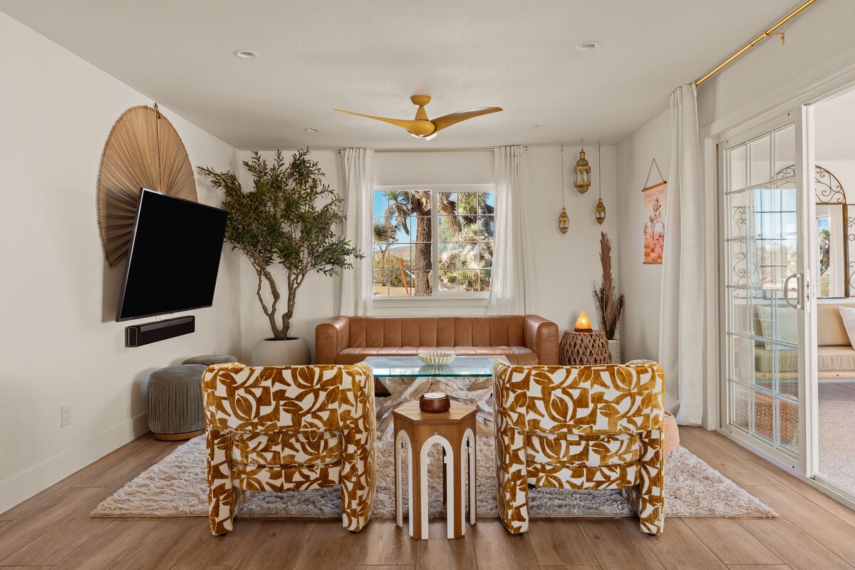 Escape to Dreamcatcher Hideaway, a stylish 2-bedroom, 2-bathroom bungalow in the heart of downtown Joshua Tree. Just a half-mile from vibrant shops, restaurants, and cafés, and only 5 miles from Joshua Tree National Park’s west entrance, this modern retreat blends desert serenity with urban convenience. Unwind in a light-filled home featuring a gourmet kitchen, home theater, hot tub, plunge tubs, outdoor dining, propane grill, fire pit, hammock, and a Level 2 EV charger.