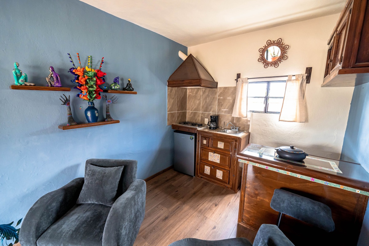 Ofrecemos un espacio para dos personas en una hermosa casa en medio de la vegetación. Tendrás privacidad y unos amaneceres hermosos. El estudio cuenta con una terraza privada perfecta para tomar un café por las mañanas. Tiene TV, una pequeña cocina y un espacio de trabajo para que puedas continuar conectado durante tu estancia.