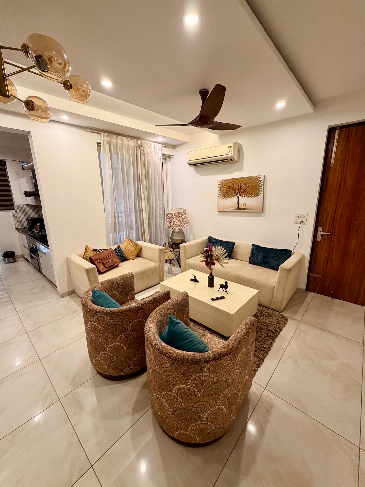 🌟 PREMIUM 3BHK HIGH-RISE APARTMENT FOR BOOKING Enjoy a comfortable, worry-free Japandi theme stay in this fully furnished 3BHK, ideal for families and corporate travelers. Features 3 king-size bedrooms, 3 modern bathrooms, 3 private balconies with amazing views, a spacious living area with 6-seater sofa, 6-seater dining table, 55-inch Smart TV, large refrigerator, fully equipped kitchen with gas stove, washing machine, high-speed Wi-Fi, digital lock, full power backup, and 24/7 security.