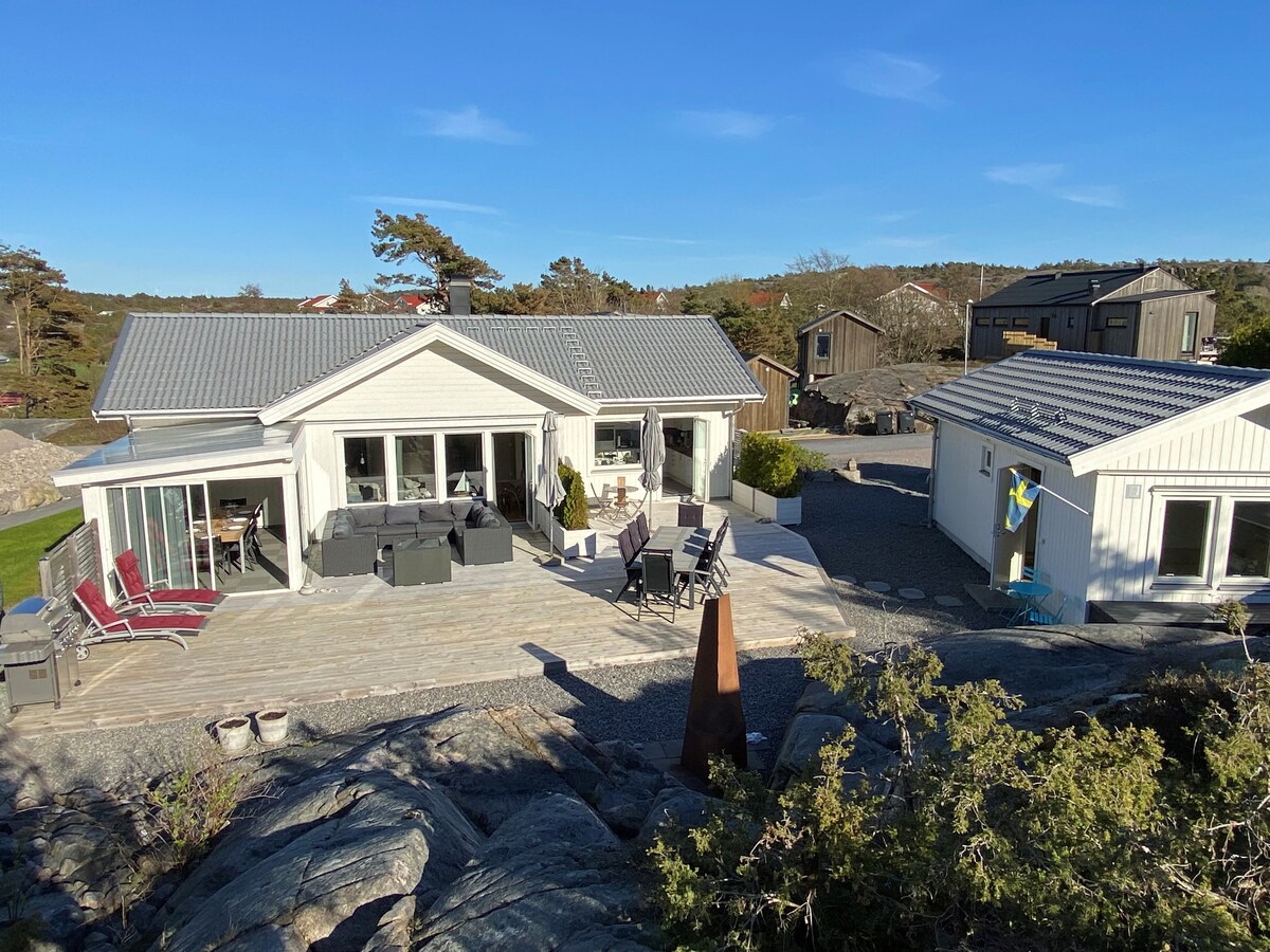 Välkommen att hyra denna underbara villa med hög standard och fantastiskt läge! Ett modernt och rymligt hus med endast 750-800m till stranden och havet! Lika nära ligger Tanumstrand Spa och resort med faciliteter såsom restaurang och bar, beachclub, minigolf, äventyrsbad, tennis, m.m. Till mysiga Grebbestad går du på 25 min. Njut av västkusten när den är som bäst, ett perfekt utgångsläge för en komplett semester i vackra Bohuslän! Lugnt beläget, men ändå nära till allt för både stora och små!