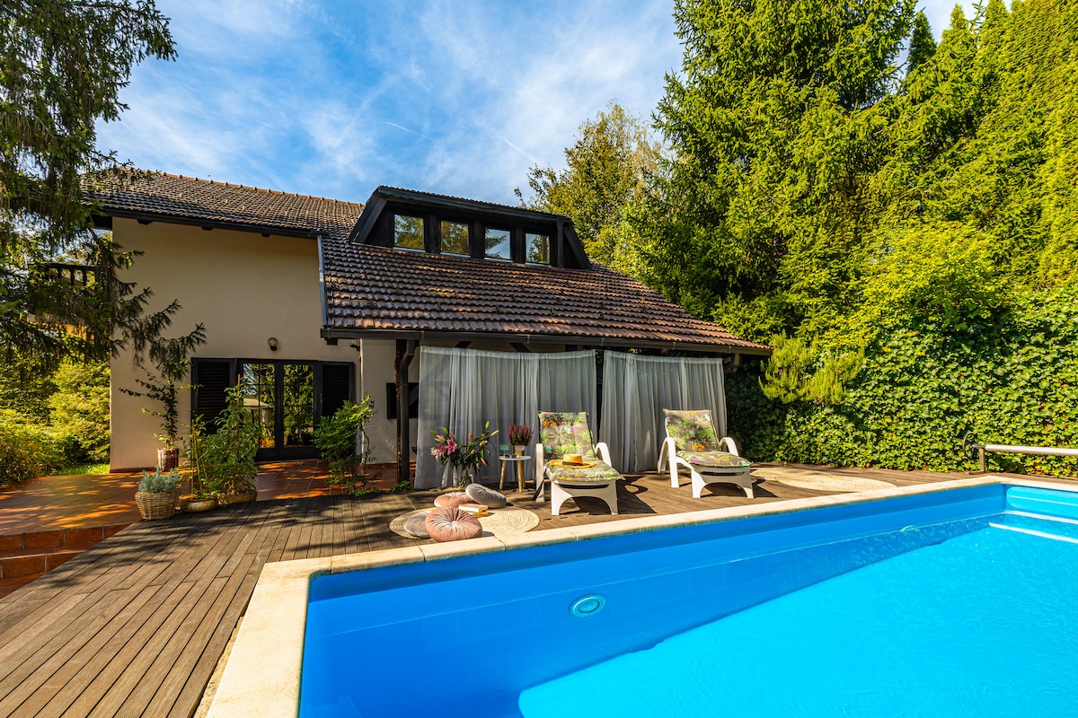 Beautiful holiday home in Vukomeričke Gorice (5+2 guests) features 3 bedrooms, 2 bathrooms, a separate toilet, living room, large kitchen, dining area, and a fun space with billiards and darts. Enjoy the outdoor pool, hot tub, barbecue, and pizza oven. Surrounded by forest and meadows, with no neighbors, it's perfect for privacy and a peaceful getaway. Large parking space. An ideal choice for relaxation and enjoying nature!
