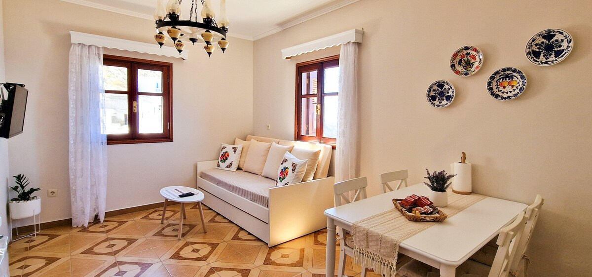 Irene’s Cottage Myrtonas is a peaceful hilltop escape, perfect for couples. Just 15 mins from Kyra Panagia Beach, it offers sea views, a large private patio with BBQ, full kitchen, cozy dining/living space, and a traditional Karpathiko loft bed with storage. With A/C, WiFi, and washer, it blends comfort, charm, and authentic Karpathian style for a romantic and relaxing getaway.