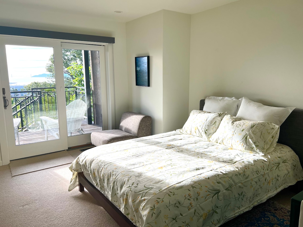 Located in the scenic, tranquil Berkeley Hills, just up the hill from UC Berkeley, this climate controlled studio offers spectacular views, privacy & a large outdoor dining area. You’ll enjoy huge windows overlooking the SF Bay, lots of natural light, a new queen bed, lounge area, bluetooth speaker & kitchenette with sink, fridge, microwave, coffee/tea station. A large monitor and standing desk makes it easy to work or stream movies using our gigabit Wi-Fi. Easy parking and bus access.