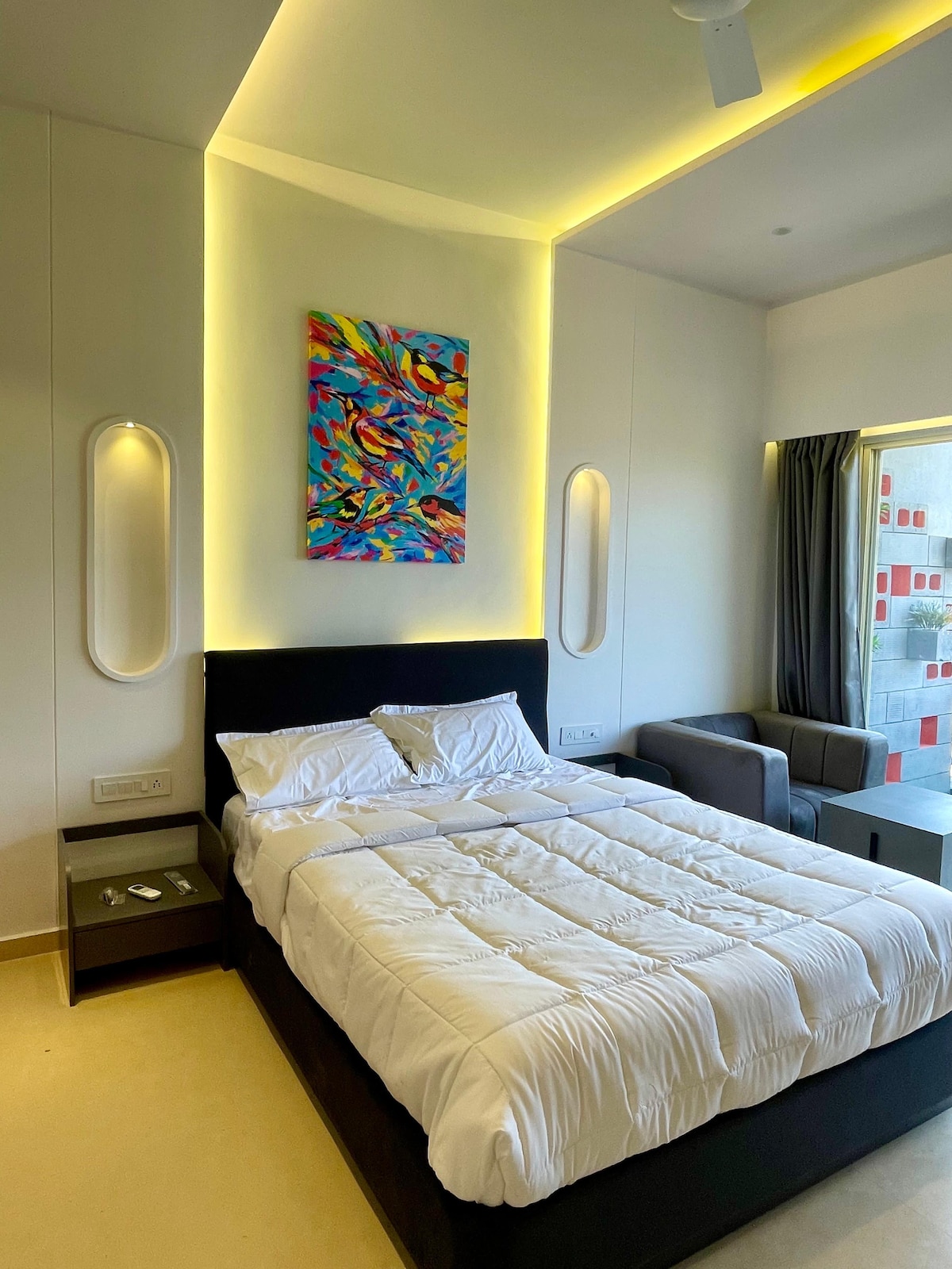 Boho Style Luxury Studio with Jacuzzi and Garden. A peaceful getaway. Fully loaded with WiFi, JBL 2.1 Home Theatre, BT Music System, Full-HD LED TV. A stylish bathroom with toiletries. Pantry with tea/coffee supplies, RO water, Microwave, Induction Hob, Fridge & s/w Toaster. Fenced garden for children. Dine in the garden with beautiful weather. Jacuzzi has hot water that can be used anytime. Common amenities on-site like swimming pool, games room, gym, mini theatre, cycling and restaurant.