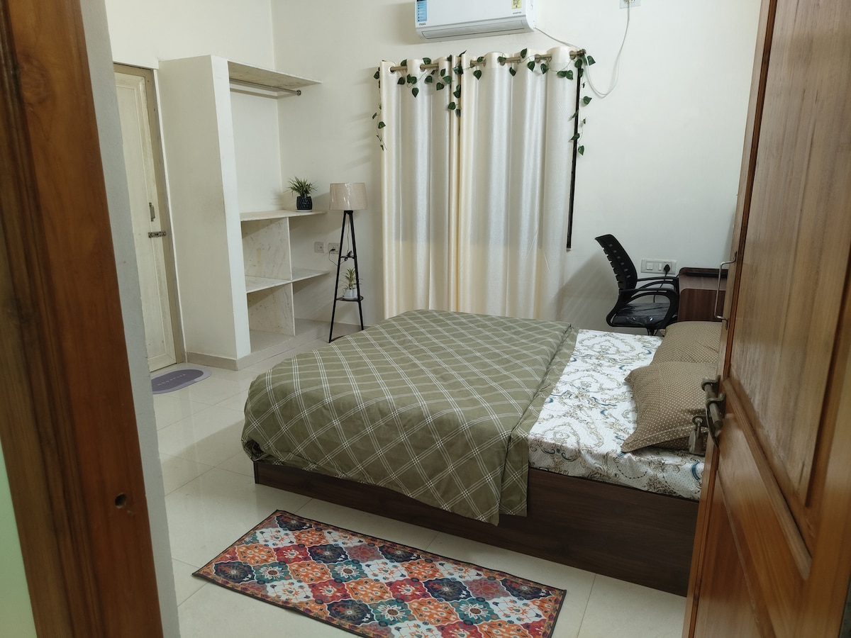 Beautifully decorated place for 2. You get- 1 spacious room (AC) - queen size bed + orthopedic mattress 1 attached toilet with comod 1 private washroom with indian toilet. 1 study table with comfortable chair 1 closet. Open terrace with plants. Not included: Geyser (you can ask for immersion rod) Wifi (Good network here so mobile internet will have no issues) Inverter (Not much power cuts in the area so generally it isn't a problem) No Lift (You have to use stairs for 2nd Floor)