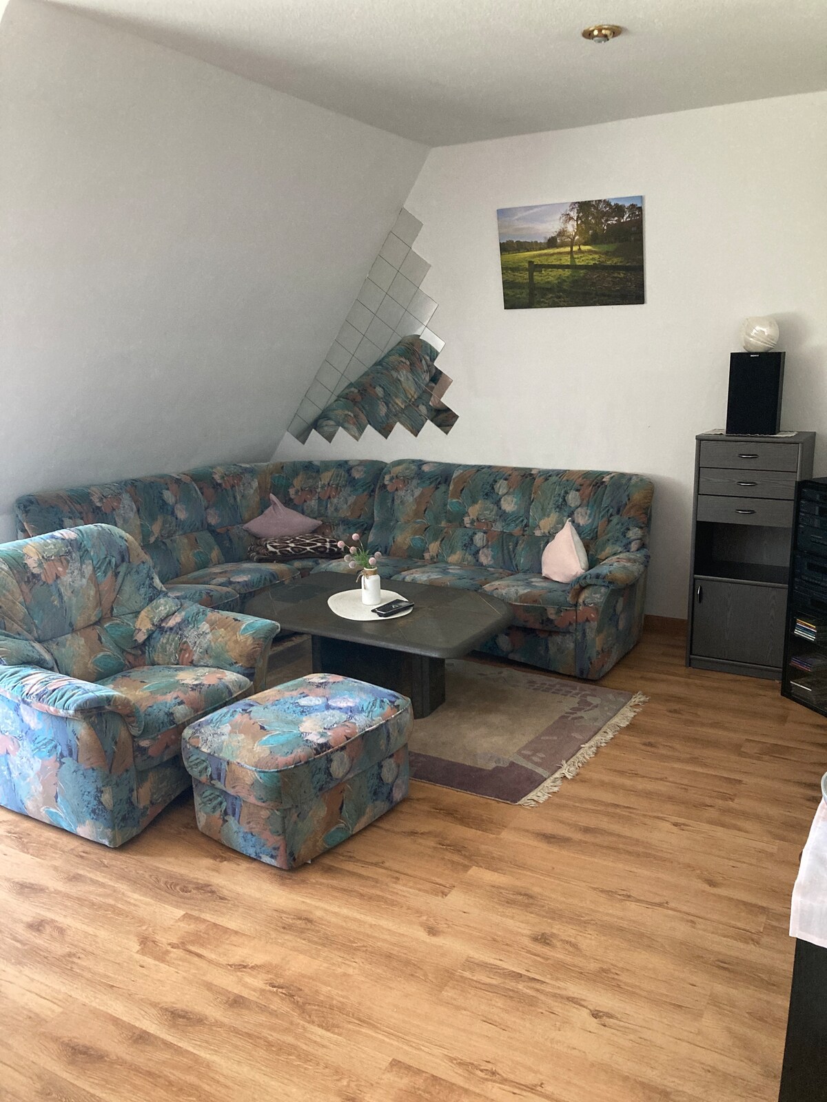 The bright, quiet apartment (non-smoking) is on the upper floor of our extension with great views of nature and directly on a small stream. The apartment has a separate entrance. Ideal starting point for walks, bike rides and excursions to the surrounding area and beyond. Verden-Ost highway exit 4 km, Niedersachsenhalle 3.8 km. Downtown Verden Cathedral is 4.8 km away. Rewe/Aldi, bakery 3 km. Bus stop 400 m.
