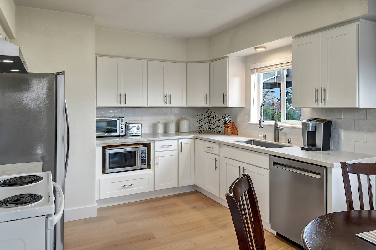 New Construction 1 bed apartment in Downtown Kirkland! Custom cabinets, quartz counters & stainless appliances! Beautiful salvaged & refinished fir flooring. Adorable bath w/ basket weave tile & soapstone counter! Private washer & dryer. WIFI & Smart TV. Vaulted ceilings, skylights & AC! This completely separate & private new construction apartment was completed in 2020 and is located above our detached garage. Perfect for short or long term stays. Live in the heart of Kirkland!