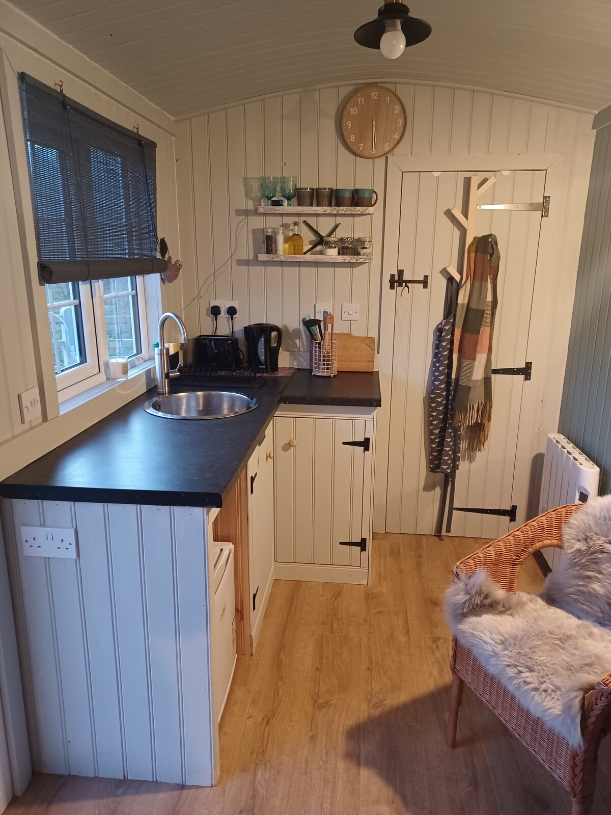 This cabin has a hexagon shape with a square porch where the front door is. The Hexagon, as I call it, is situated on its own on land that is half orchard half woodland. On the morning sun side, where the door is, the decking leads to the little purpose built bathroom building. There is a perspex canopy so you can walk over staying dry even if it is raining. A few goats and a few hens roam in the adjoining field.