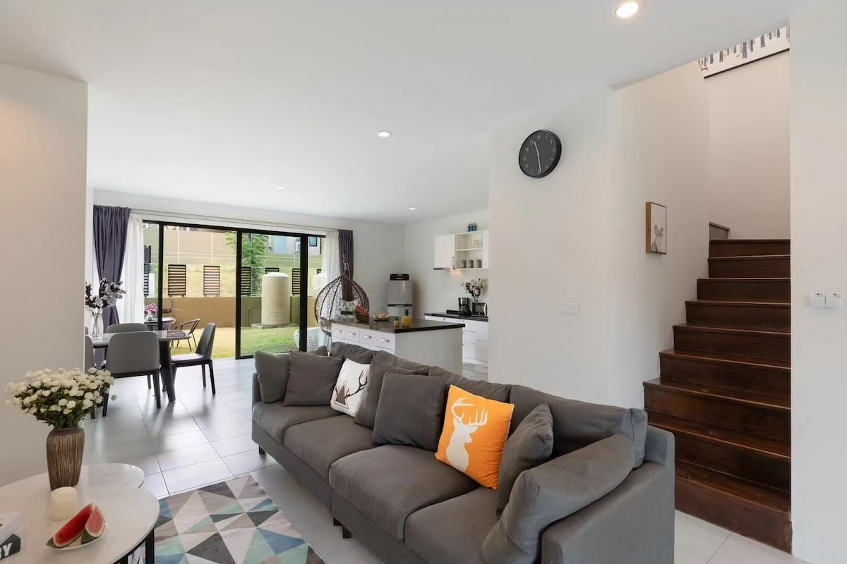 For 14 and 14+ days rates electricity and water bill will be charged separately. Average bill for 1 month is around 7000 Baht . Can be less or more , mostly depends on air conditioning. The complex is located just few minutes walk to the breathtaking Choeng Mon beach. The first floor of each townhouse is a spacious air-conditioned living room The second floor has two bedrooms both equipped with air-conditioning and built in wardrobes.