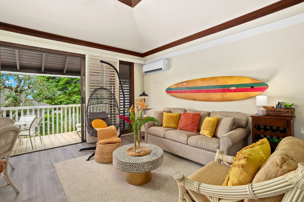 Remodeled bright & breezy top floor, corner unit in exclusive Bld 23. Steps away from top rated Poipu Beach. Privacy. Whole home A/C (dual split in living & window unit in bdrm). Fast Wifi. King bed, queen sleeper sofa & twin in the living room comfortably sleeps up to 4 people. Updated furniture and appliances. 65” Smart tv. Filled w/extra amenities, beach gear, fully equipped kitchen, cooking staples suggested experiences & babysitting recs around the island, offering a priceless stay