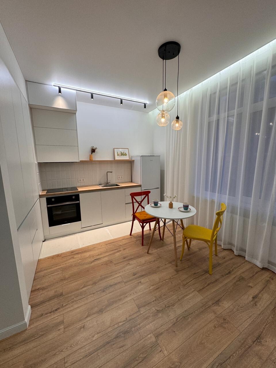 Recharge in this calm and stylish place. Modern apartment with designer renovation and thoughtful atmosphere. A spacious bedroom with a comfortable bed and blackout curtains, a stylish bathroom with marble tiles and a washing machine, a cozy kitchen with a bar area and modern appliances. Large backlit mirrors and warm wooden accents create a feeling of coziness. Great location close to restaurants, shops and transport — perfect for rest and work.