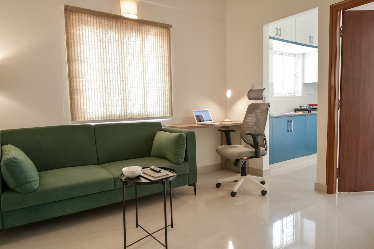 BLUO STAYS - Award winning Homes! Private Studio in heart of city at Koramangala. Ideal for Single Guests & Couples - short drive from HSR Layout, Indiranagar & Bannerghatta Road. Spacious, non-sharing Studio with Balcony, Designer Bed, Work Desk, Bathroom & Kitchenette with Cooktop, Fridge, Microwave, cookware etc, plus Terrace Garden with al-fresco seating. All-inclusive Daily Rental - WiFi Internet, Netflix/Prime, Cleaning, Washing Machine, Utilities, 100% Power Backup,Lift.