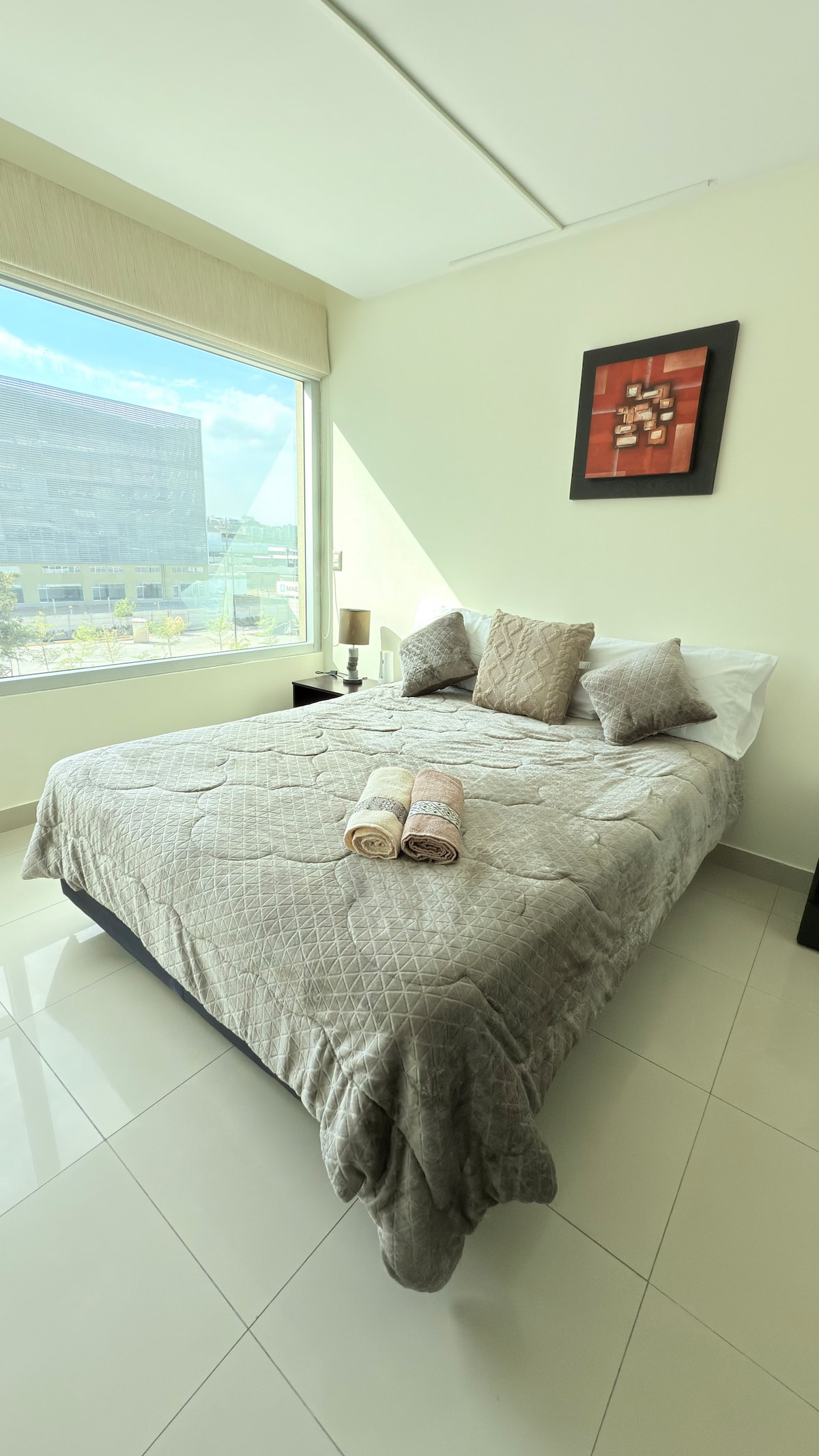 Modern minimalist-style apartment in Samborondón, located in a privileged area with 24/7 private security. Ideal for families or executives seeking comfort and tranquility. Right in front of El Dorado Mall. It features 3 bedrooms, each with a TV with Netflix and air conditioning. The living room includes a 65” TV. You also have 100 Mbps high-speed internet, perfect for working comfortably and enjoying a practical, relaxing stay.