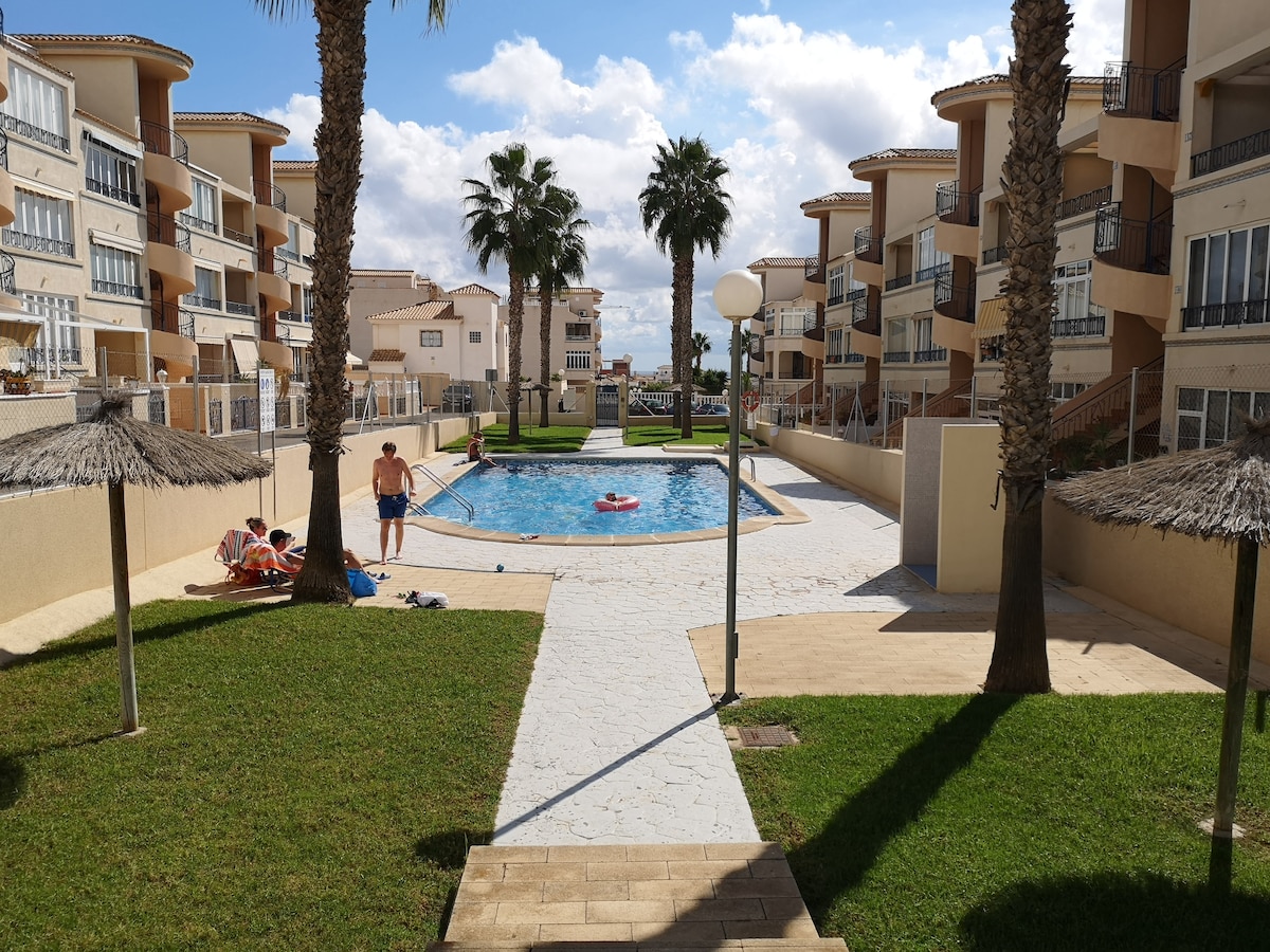 Cozy apartment located in the middle of lovely Punta Prima, located outside Torrevieja 2 bedrooms, 2 bathrooms and 2 large terraces. One with morning / morning sun, and one with afternoon / evening sun. Fenced, quiet area with pool and playground. Wi-fi and AC are available, as well as dishwasher and washing machine. Fully equipped kitchen. Grill Close to several different nice beaches, shops, amusement parks and restaurants. Walking distance to one of Europe's finest shopping malls; La Zenia.