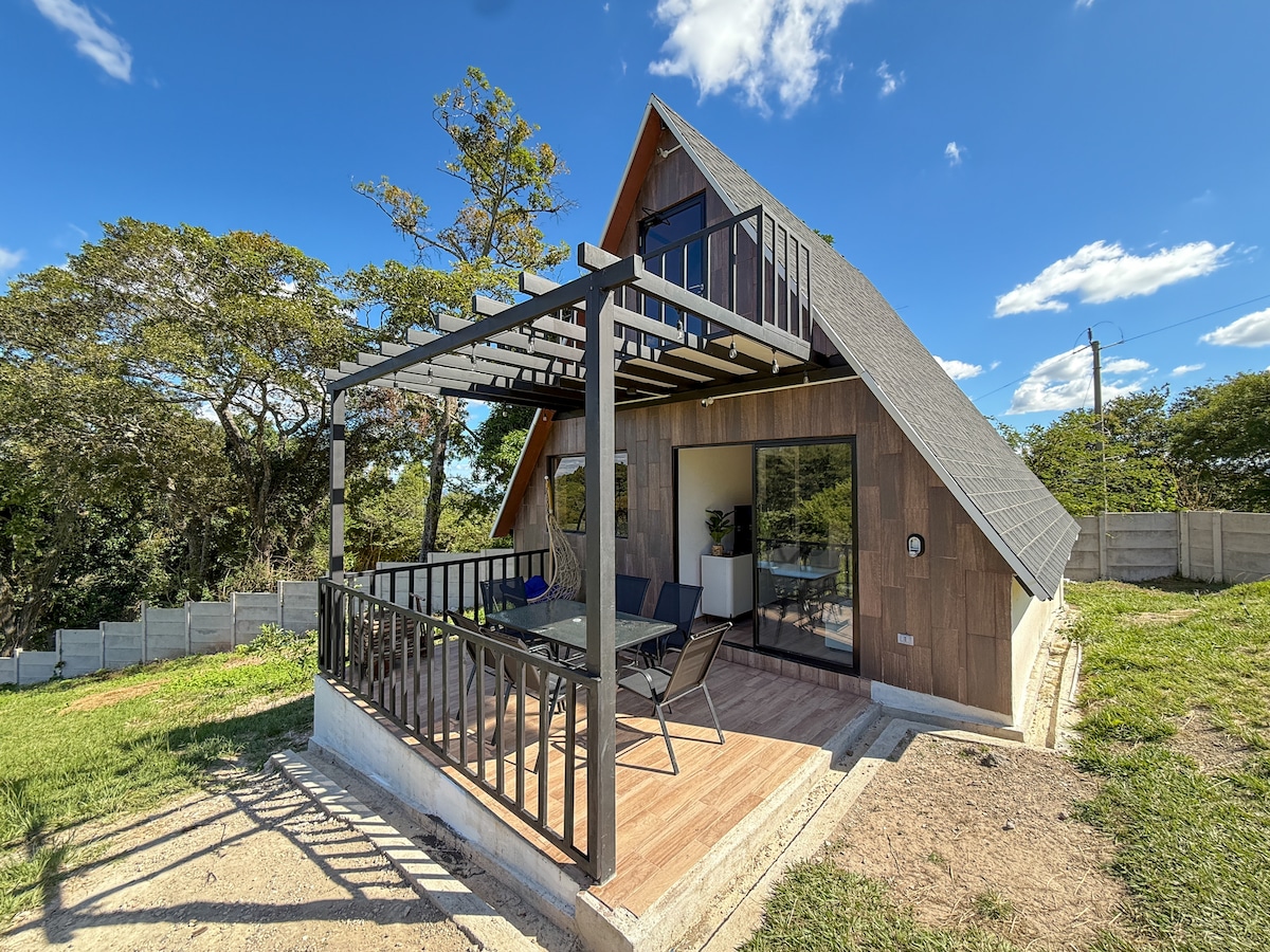 This cabin provides calm and serenity with the view of 3 volcanoes and the pacific ocean, while you listen to the waterfall peacefully seated on our swinging chairs. This place was designed to enjoy the outdoors but with all the amenities you would need inside. A large open space below great for BBQ, reading a book or taking a nap in our hammocks with the greatest view. The cabin on top has AC with a full size kitchen, fridge and a hot tub. The bedroom allows you to sleep watching the stars.