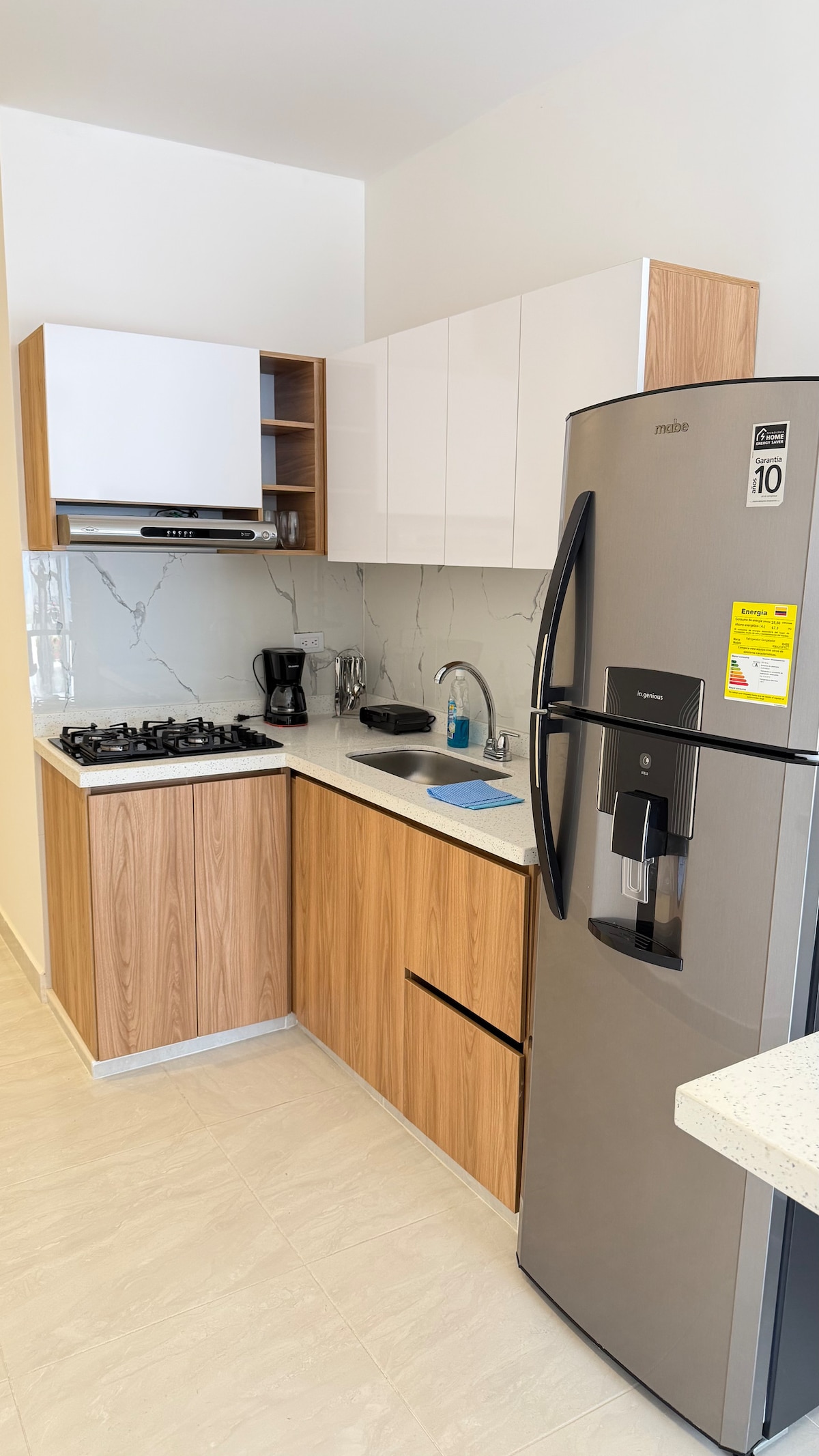 Disfruta de tu estadía en nuestro aparta estudio completamente amoblado, cuenta con cocina integral, nevera, dos sillas para bar, lavadora, tendedero, cama doble, sofá cama, colchón inflable, 2 TV pantalla plana, aire acondicionado, ventilador, ducha, servicios de agua, gas, energía y wifi incluidos, incluye toallas y sábanas limpias, jabón - shampoo, papel higiénico, Movistar TV. El espacio se puede adecuar con sofá cama y colchones inflables para 2 o 3 personas más.