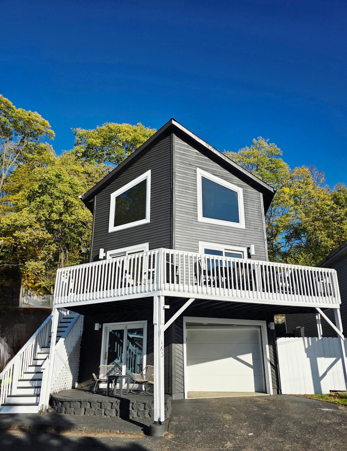 This unique place has a style all its own. This corner lake house comes with a huge fenced-in yard, as well as a balcony off of the master bedroom and 2 parking spots. We offer 3 kayaks with life jackets, 1 paddle board, paddle boat and fishing poles, fire pit, outdoor and indoor games. We have 3 bedrooms with beds included, as well as a futon couch a trundle bed and a pull-out couch bed (6 potential beds total). This comes with 2 TVs, fireplace, WiFi, bar, new fridge and more.