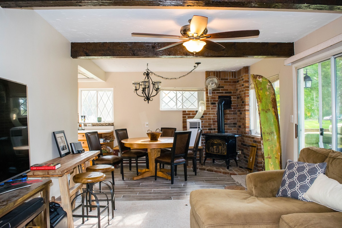 Escape the city to this modern chalet with rustic styled interior. Nestled alongside the winding Hersey River, this home is the perfect retreat for couples, families or small groups. With a wrap around porch designed for entertaining, you can take in the sounds of the river or enjoy the outdoor firepit. At night, escape inside to a warm fireplace and relaxing evening. With easy access to nearby hiking, fishing and kayaking, this chalet offers endless possibilities for outdoor adventure. *