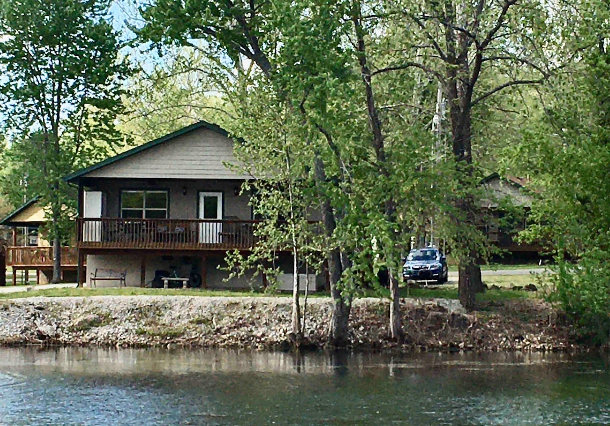 Lakefront cabin only 20 minutes from Branson! Ready for quiet? Relax on your spacious deck and hot-tub and feel the breeze coming off beautiful Lake Taneycomo. Walk out your door to fish and kayak, or put your boat in the rented dock slip and fish the many bass, bluegill & trout stocked yearly. Swim in the large sparkling resort pool. Walk or bike through park- like Edgewater Beach Resort, Empire Park, and below Powersite Dam on the paved, wooded trail. Play disc golf next door at Empire Park.