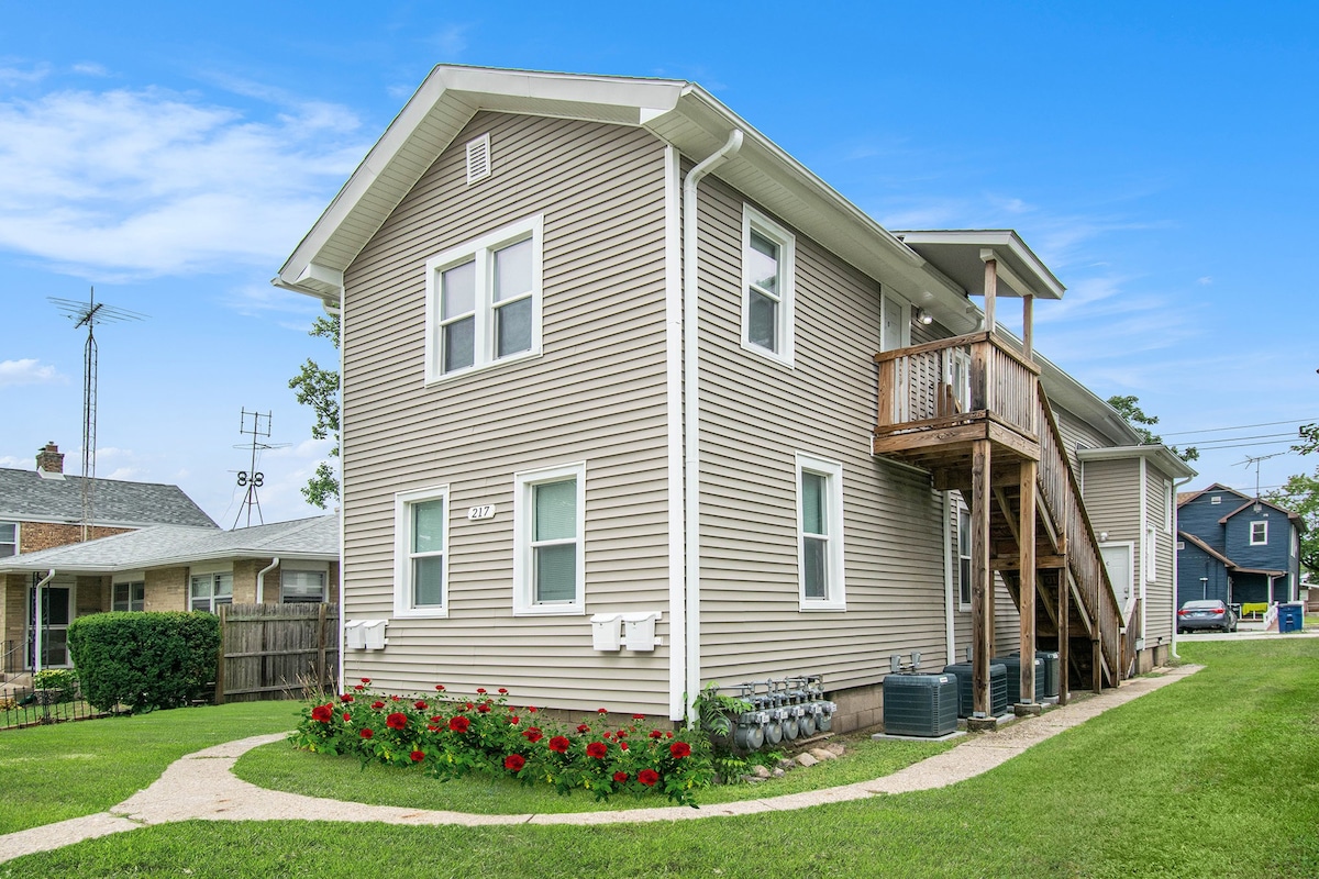 Our charming one bedroom (King)apartment is perfect for a getaway in NW IN and will provide everything you need to have an enjoyable stay! Located near Lighthouse Outlets, Restaurants, Casino, Breweries, Indiana Dunes National & State Parks (7 -11.3 miles), Washington Park (1.4 miles) and more! South Shore Line electric train platform is right behind property. (in quiet zone). Day trips are easy to downtown Chicago or South Bend IN. Catch a Notre Dame game one day and see the Bears the next.