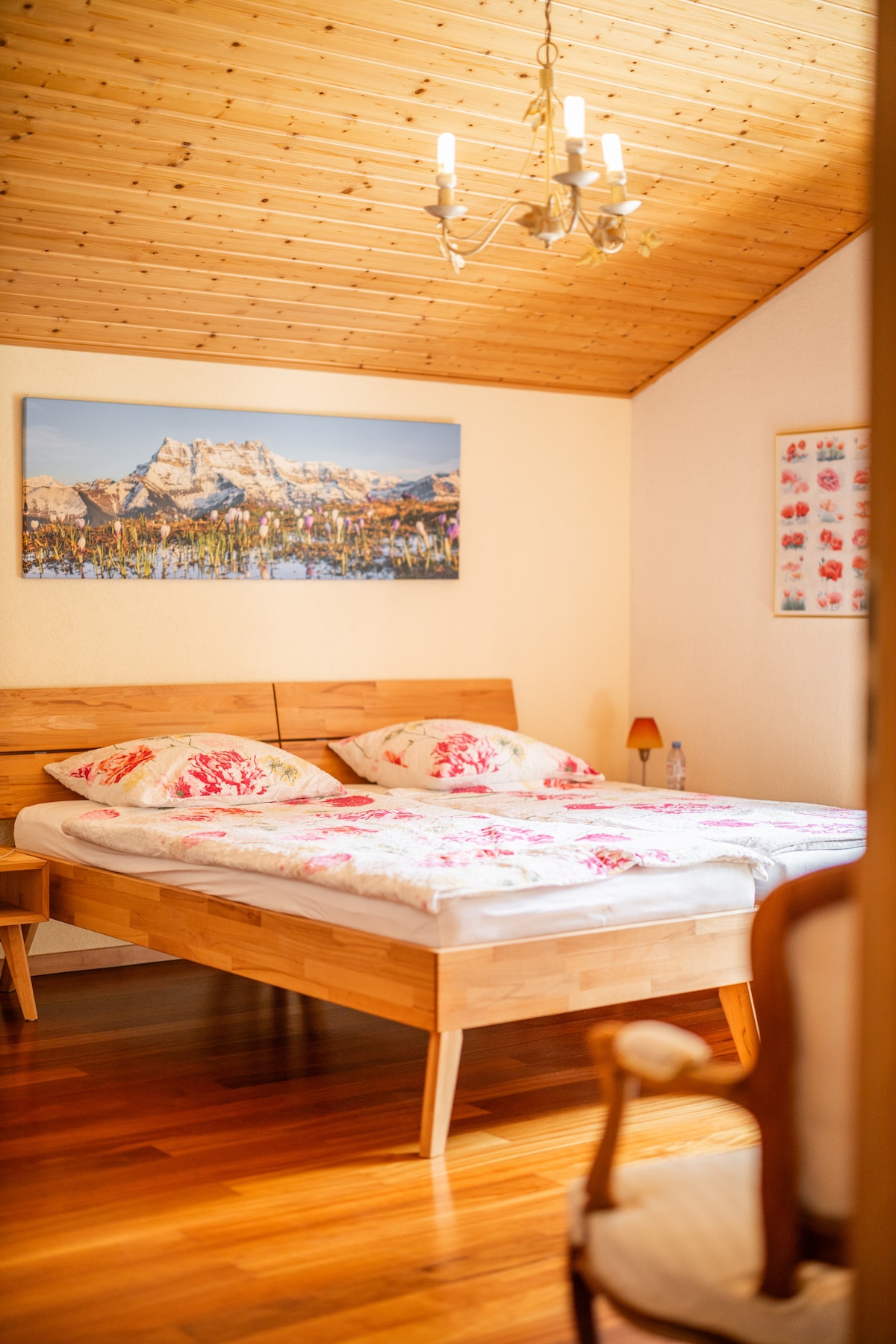 Extremely cozy double room with sumptuous views of the lake, Alps and vineyard, walk-in shower, separate toilet, wood stove usable in winter. You’ll love the stylish decor of this charming place to stay.
