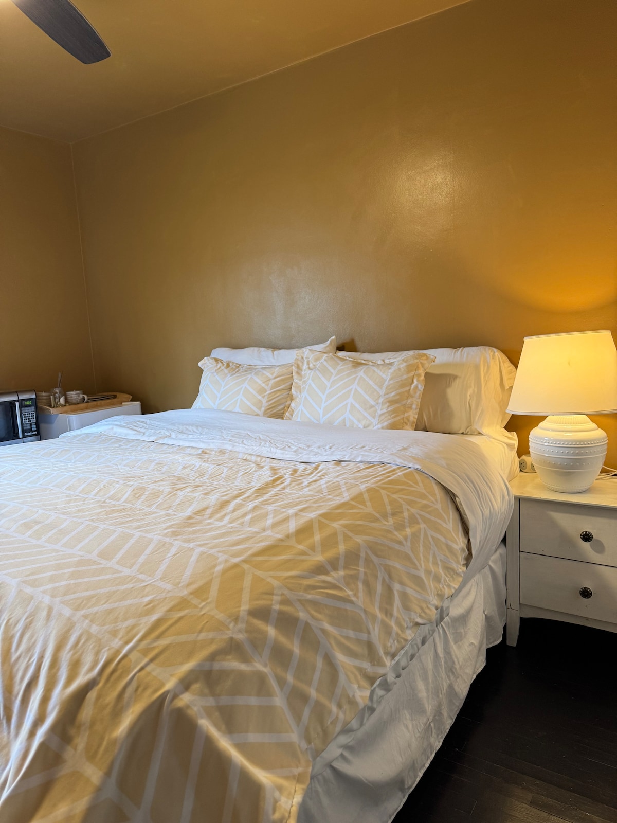 This is a comfy little studio attached to the main front property. You would have complete privacy with a private entrance and self-check in. The studio has a standard queen size bed (60x80in), bathroom, closet space, small dining table & a desk/office space. There is not a full kitchen, but the room has a mini fridge, microwave & k-cap machine. -Good for business travelers & solo adventurers -Free parking available on the premises