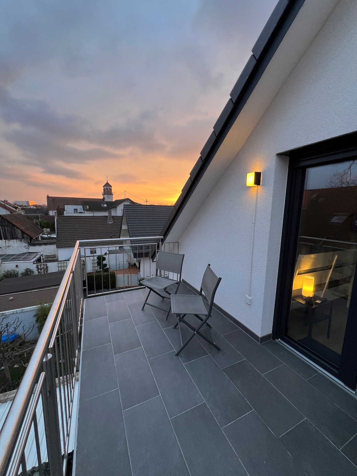 Modern attic apartment with large roof terrace, near Campus Nord (KIT) with fully automatic coffee machine, glass shower and bathtub & complete kitchen in a 3-family house in a quiet residential area, Street parking is available. A bicycle you bring along can be parked safely in our garage. Netflix & Amazon Prime are unlocked on the TV.