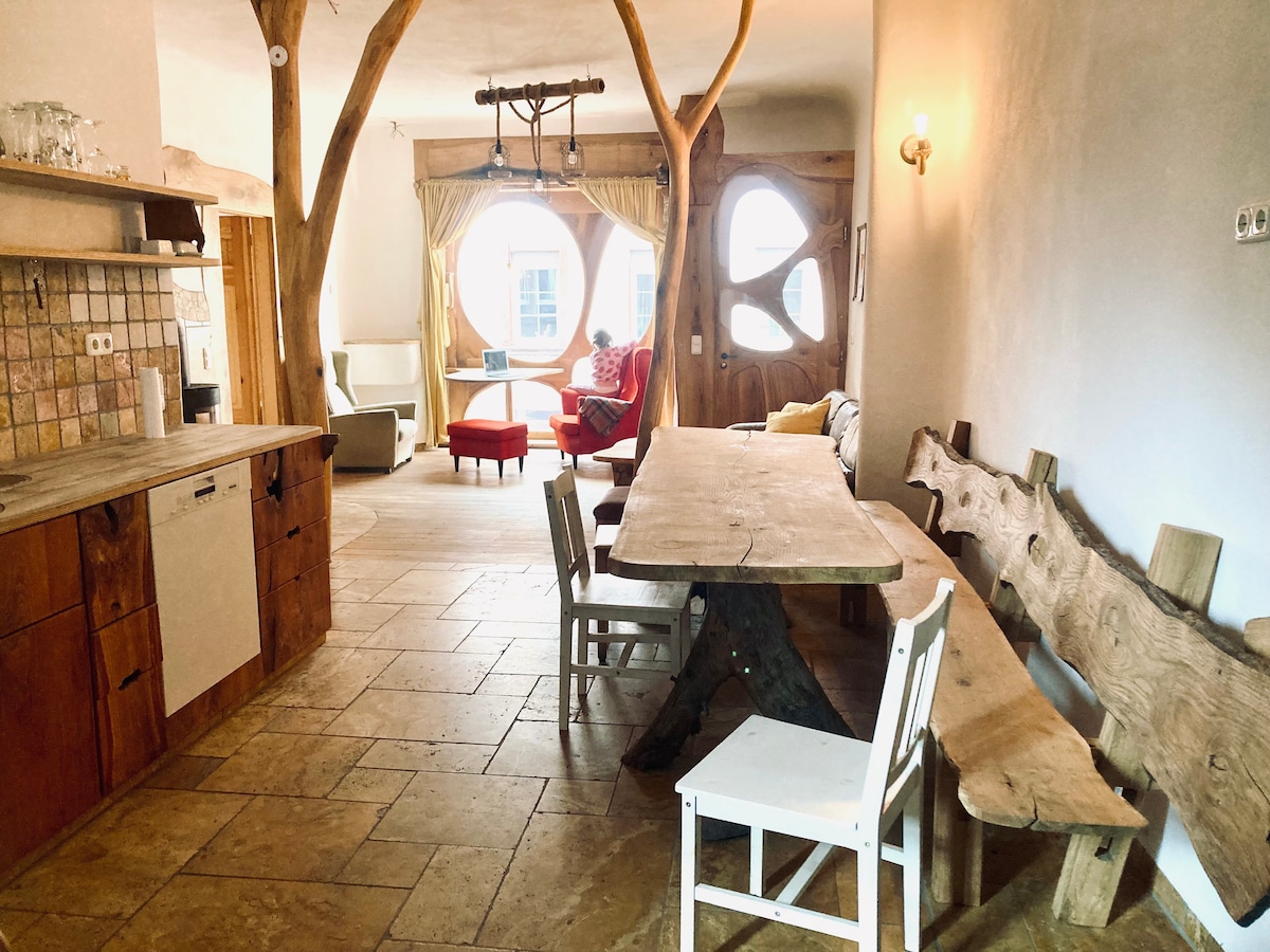 On the main road of Annweiler, two minutes from the historic market square, is the Künstlerhaus Annweiler. Nestled in the largest forest area of the Palatinate, climbers and cyclists shake hands. The apartment is built for small groups and families from local woods and sustainable materials for sustainable and loving living. The fireplace contributes to well-being in winter. Looking forward to seeing you soon!