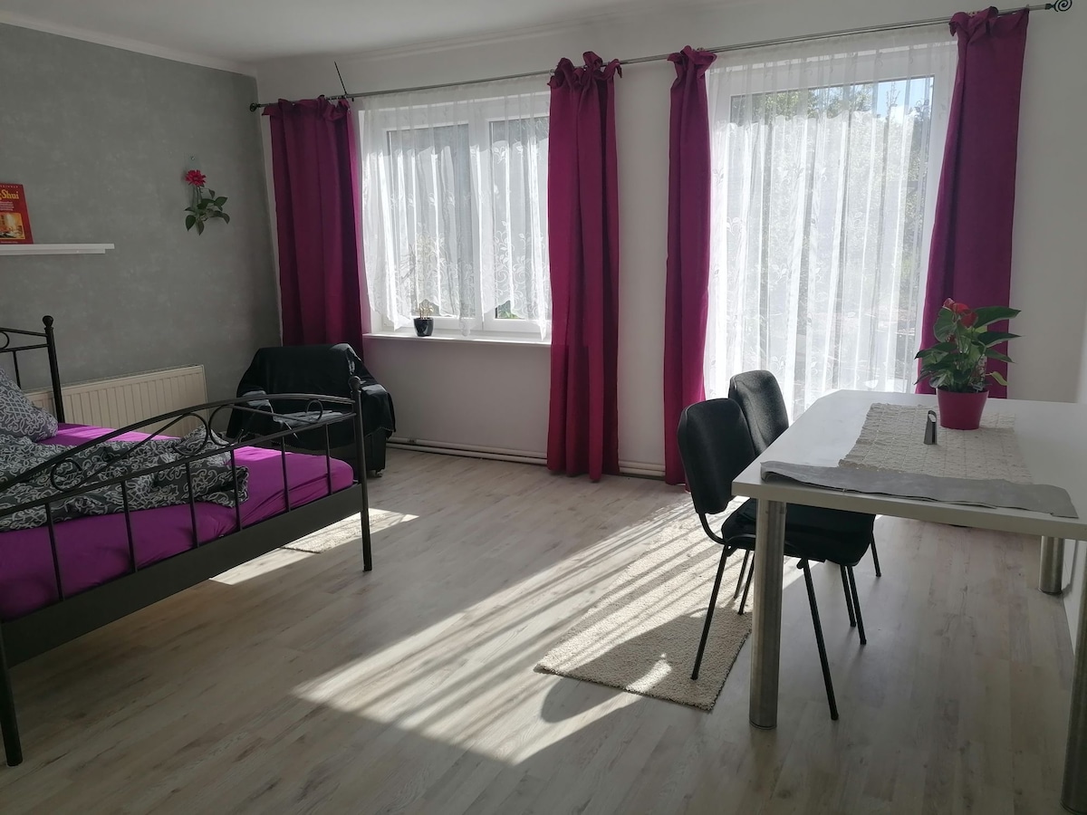 This newly renovated two-room apartment is located near the Weiden Süd motorway exit. After the entrance area you get directly into the apartment with a well-equipped kitchen. In the living area there is a sofa bed. A dining table with three chairs is also available. In the bedroom, in addition to the 1.80x2.0m bed, there is a wardrobe and a clothes rack. In the bathroom there is also a bathtub in addition to the shower. The guest parking lot is on the property.