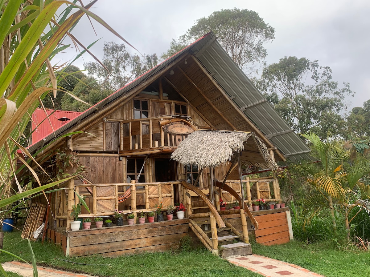Beautiful handcrafted cabin in wood and guadua, but with all the comforts of a large resort, with jacuzzi, hydromassage shower, fireplace, full kitchen, fire pit, bar, minibar, refrigerator, washer-dryer, and much more. Relax in this unique and quiet getaway.