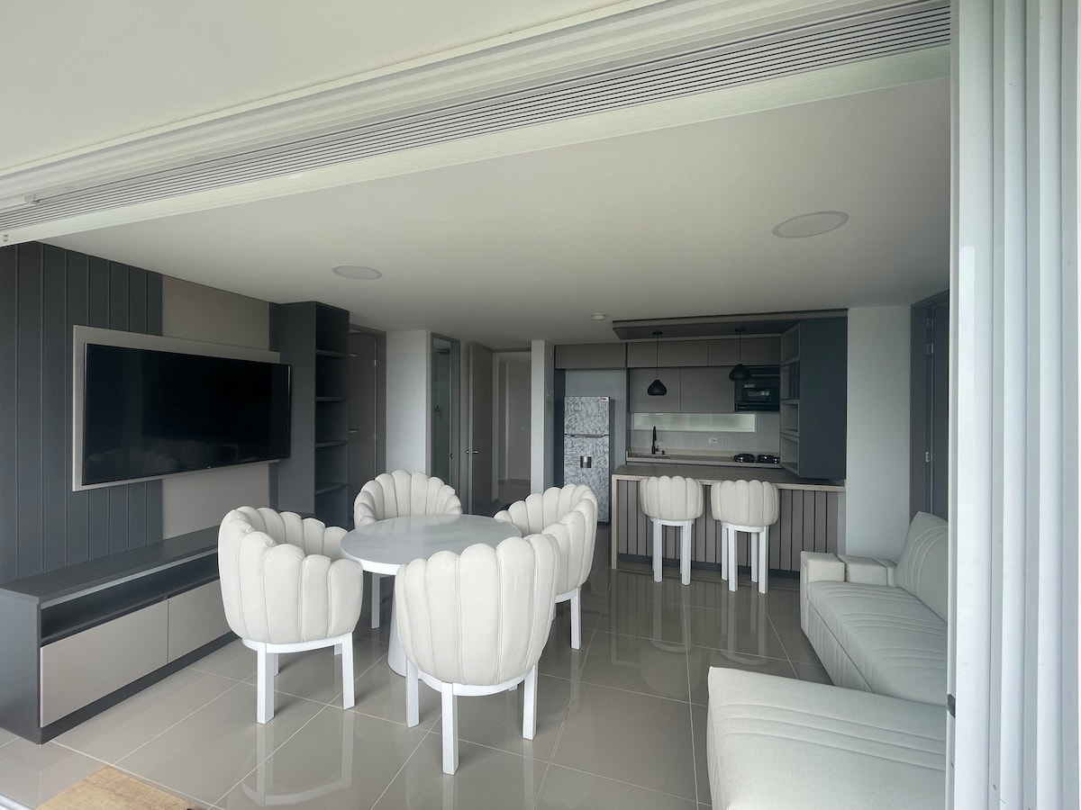 Enjoy Santa Fe in an apartment with luxury design and finishes, within a unit with resort-like amenities. Located just a 7-minute walk from the main park and close to local restaurants. Our apartment has 76 m2, 2 bedrooms with air conditioning, 3 full bathrooms, equipped kitchen, laundry area with washing machine, living room with TV and a large balcony with outdoor dining area, and an excellent view. Ideal for couples, families and friends looking for comfort and relaxation