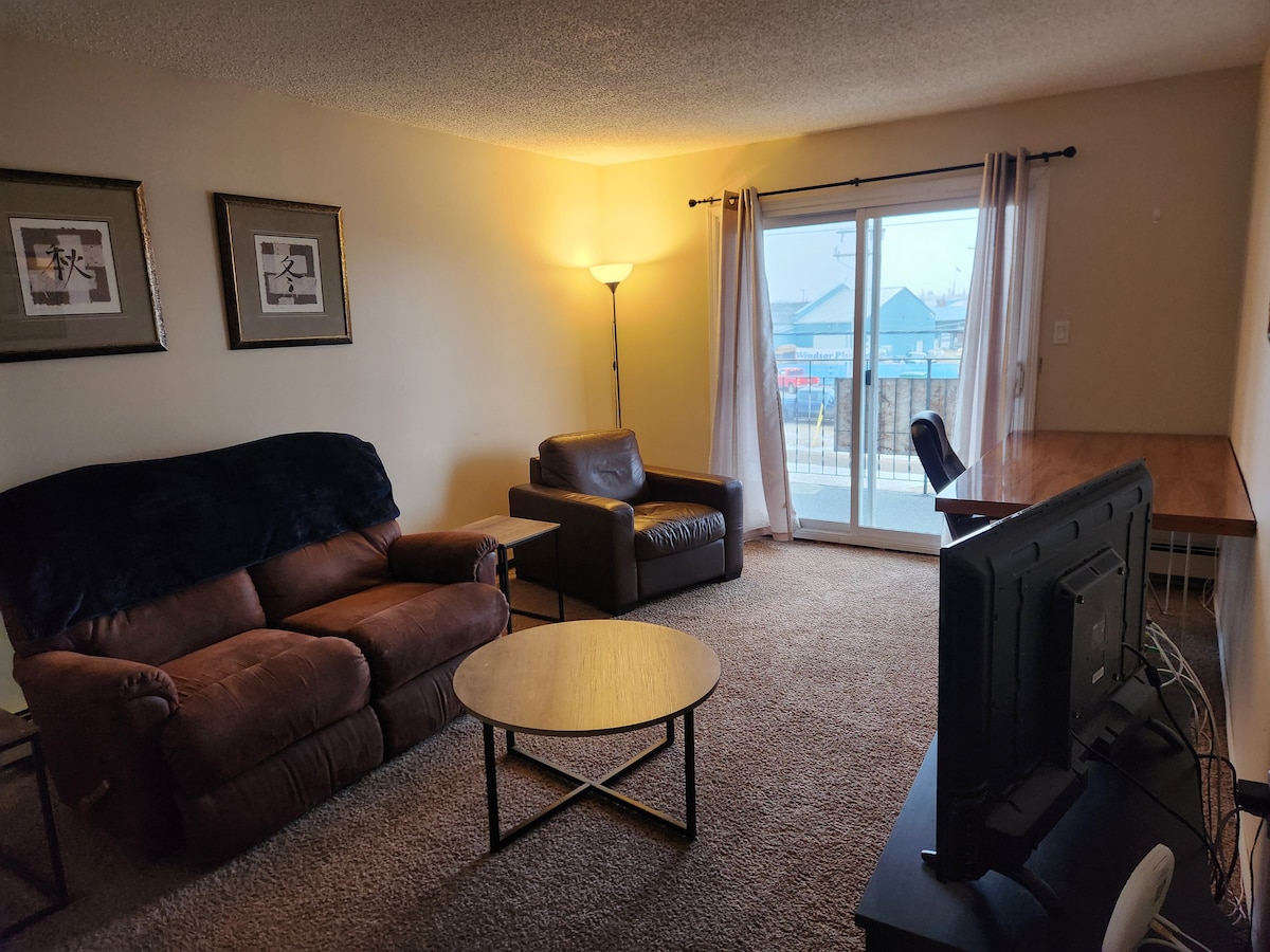 This third floor balcony 2 bedroom unit has everything you need to live and work comfortably during your stay in Lloydminster. It has two Queen Beds with Bedding and Towels Included. It includes Telus Cable with Sports, Internet Router, Comfortable Love Seat and Double Recliner, Dining table/chairs, and a fully stocked kitchen with Dishwasher, Keurig, Microwave, Toaster, Pots, Pans, Cutlery, Utensils and Dishes. We also just put a brand new bath tub, toilet, and dishwasher in the unit!