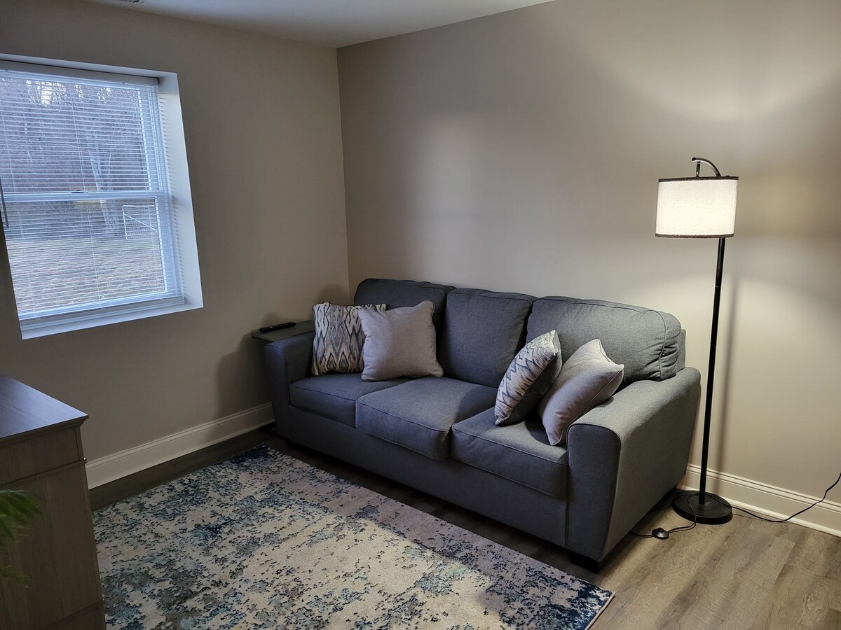 “Stay Awhile” is a spacious walk out basement apartment in our home, very clean, in a quiet neighborhood minutes from Old Town Fredericksburg, University of Mary Washington, Fredericksburg Convention Center, FredNats baseball stadium, restaurants, shopping, historical sights, battlefields & Heritage Trail along the Rappahannock River. We have a walk/run/bike trail in our neighborhood and a tandem bike you may borrow. Enjoy our 82” TV and WIFI. We are 1 hr from DC & Richmond