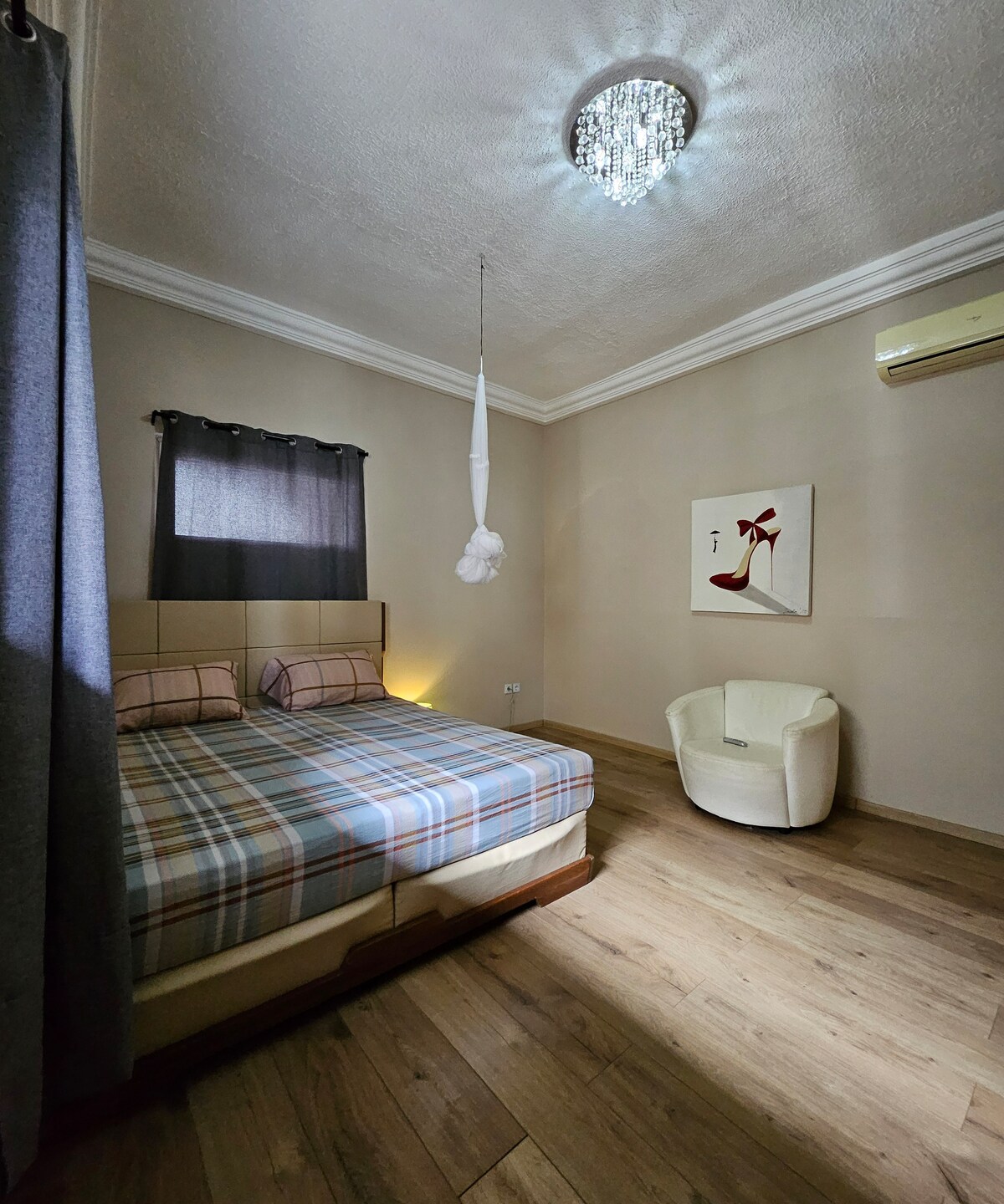 Enjoy a stylish, large and very spacious accommodation located in the heart of Lomé. Air-conditioned rooms with balcony, 3-seater bed, individual shower room (water/dryer)living room cmimatized, library desk, dining room Air-conditioned with fridge and TV. Fully equipped kitchen; microwave, washing machine, utensils and cutlery. Relaxation area, tennis table green area. Apartment under video surveillance with garage. 7/7 cleaning,electricity etc. All charges included in the rent.