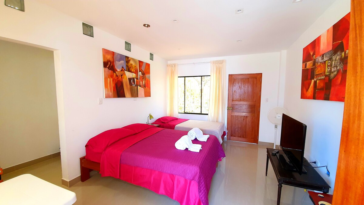- Hotel room (12 m2), located 100 meters or one block from the beach in the center of Máncora.- 01 Double bed, private bathroom, located on the first floor.- Standing fan, it has a medium closet with a hanger, bedside tables, a window with mosquito netting to prevent insects from entering your room and overlooks the garden and the hotel pool, - it does not have a view of the beach. - no hot water. - there may be noise from outside.
