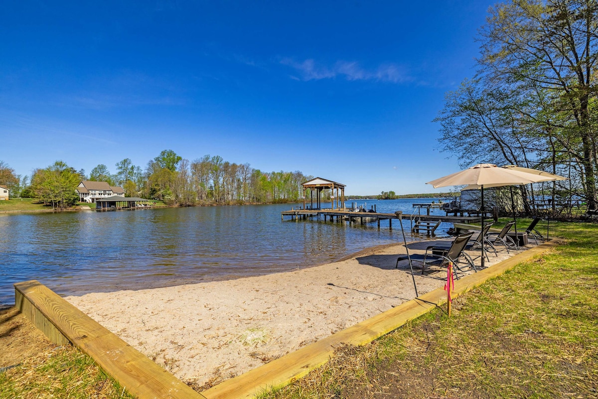 Amber Sunset is a lakefront home on Lake Anna with a covered dock, private beach, and kayaks at the water's edge. Relax in the hot tub, gather around the stone fire pit overlooking the lake, or challenge everyone in the game room with its pool table and teal-walled bar. Inside, a two-story living room with herringbone accent wall, open kitchen, and screened porch keep the group connected. Multi-level decks wrap the home with dining, lounge seating, and a ping-pong table. Three bedrooms plus a bu