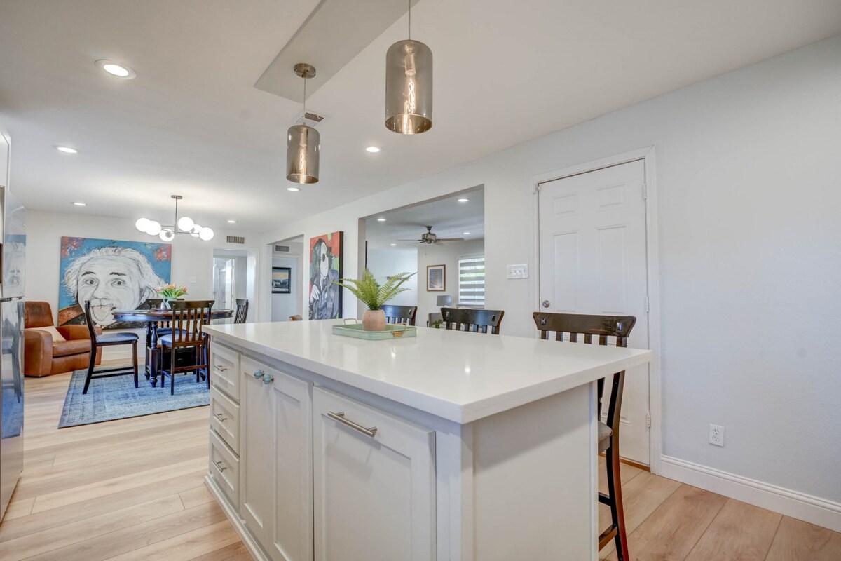 This Boho themed getaway is ideal for families & group stays! Featuring a full kitchen, fast W-Fi, two living areas, and a 65" SmartTV (Complimentary Netflix, Hulu, Amazon). Recently updated throughout the home with a modern & functional atmosphere designed for guests to relax & unwind. Beautiful backyard with large trees, fully fenced grass yard, covered back patio and outdoor games, perfect for entertaining guests. We look forward to hosting your stay!