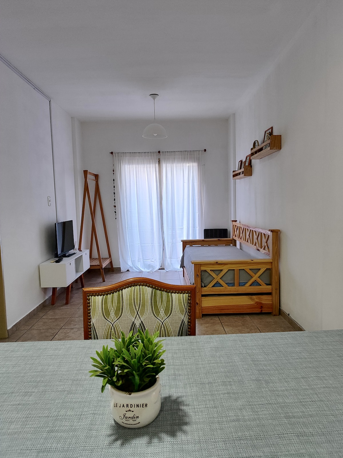One bedroom apartment, located 10 minutes from the city center. It has all the amenities to spend a great stay. The second bed is located on the livin, under the TV where a red piece of furniture is observed.