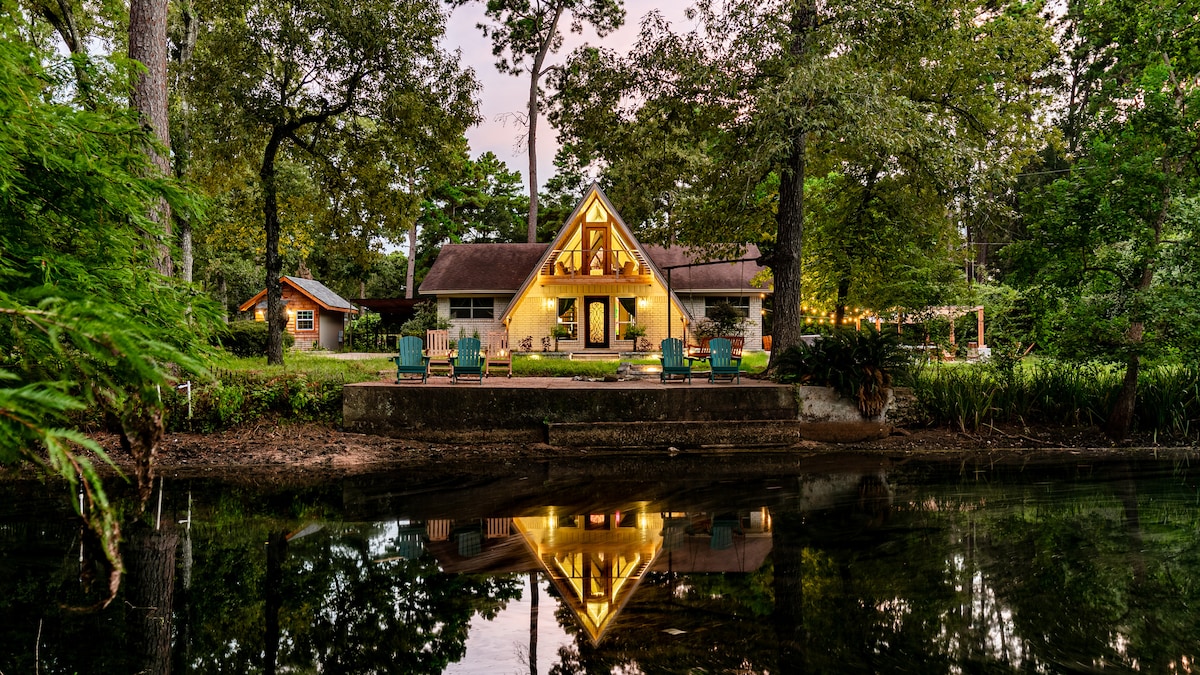 Escape to this peaceful 1-bedroom cottage surrounded by nature. Cottage features soft neutral tones, natural wood textures, and gentle lighting. Enjoy a fully equipped kitchen, cozy living room, modern bathroom, and a plush queen bed for restful sleep. Spend your days fishing, boating or paddle boarding on the private lake. Just minutes from the famous Texas Renaissance Festival, this tranquil retreat is the perfect blend of calm, comfort, and countryside charm.