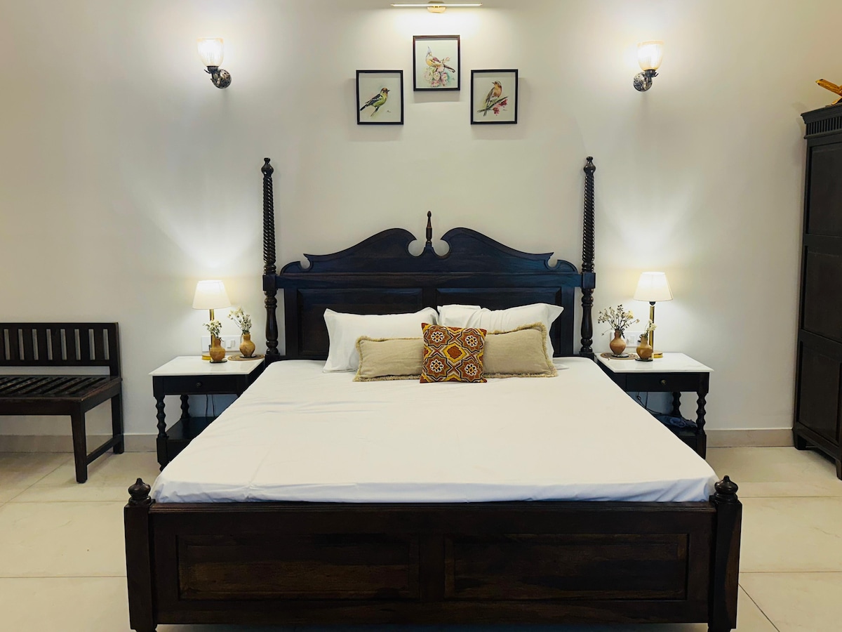 "The Golden Door" is an artistically designed room with an attached bathroom on a private terrace with panoramic views of the Aravali Hills. Ideal for couples, solo travelers, and business professionals, this accommodation seamlessly blends aesthetics and functionality. Its central location grants easy access to major attractions. In essence, "The Golden Door" transcends conventional stays. With its central location, artistic design, and comfort, it provides a simple yet unique stay.