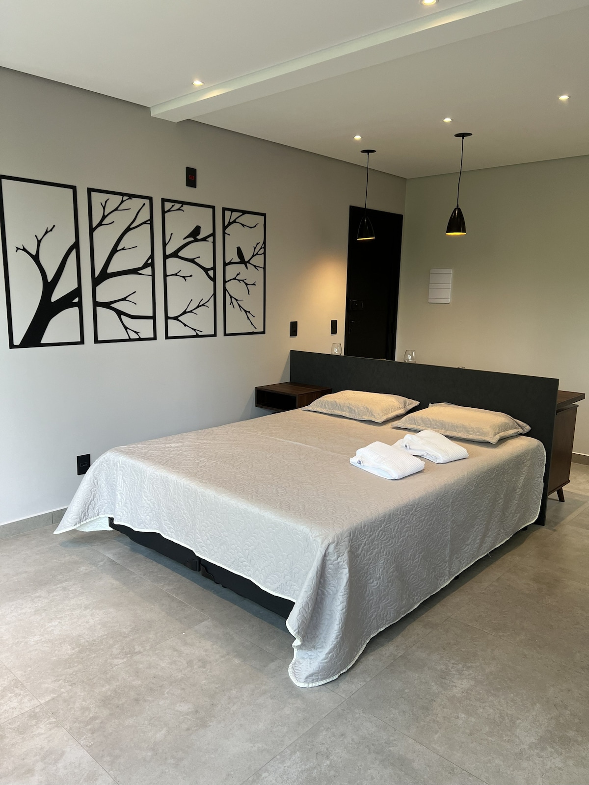 Enjoy a romantic and relaxing experience in a space with panoramic windows overlooking the forest. Relax in a soaking tub with a view and warm your nights by the charming fireplace. The suite combines comfort and design, with a queen-size bed, a dining area, and a relaxation corner. Located in a gated and secure subdivision (24/7), you'll have access to the serenity of the dam and the mountains. You'll be in complete contact with nature: wake up to the sound of birds and renew your energy.