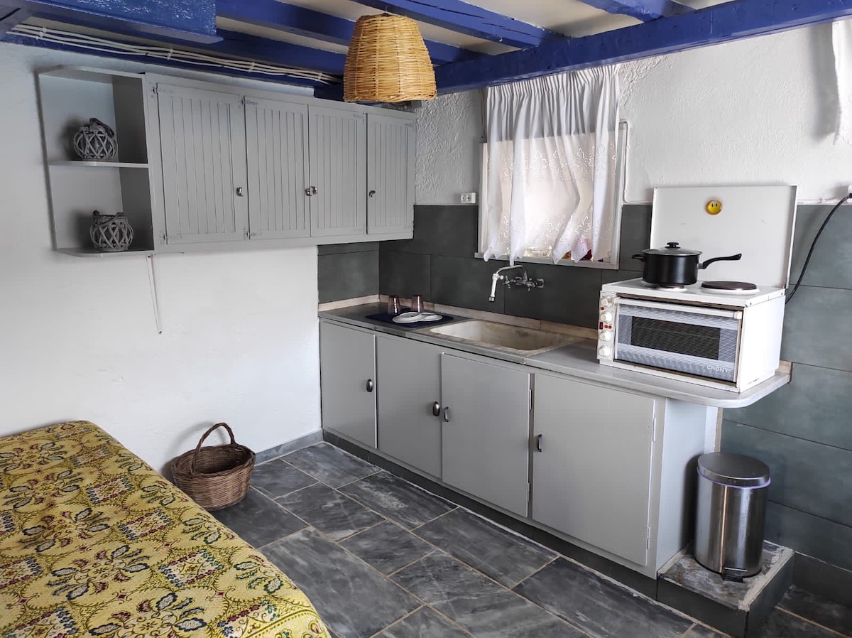 The house is located at Agios Romanos' beach. The beach can be accessed on foot. There is a tavern, a small cafe and a beach bar. The sofas and the KIng size bed are built-in. The most outstanding feature of the house is the unique view, which you can enjoy from every room and the balcony. After every accommodation, the house is sanitized with the use of a steam cleaner and detergents that contain chlorine. During your stay and if you wish to, the house is cleaned every 3 days, free of charge.